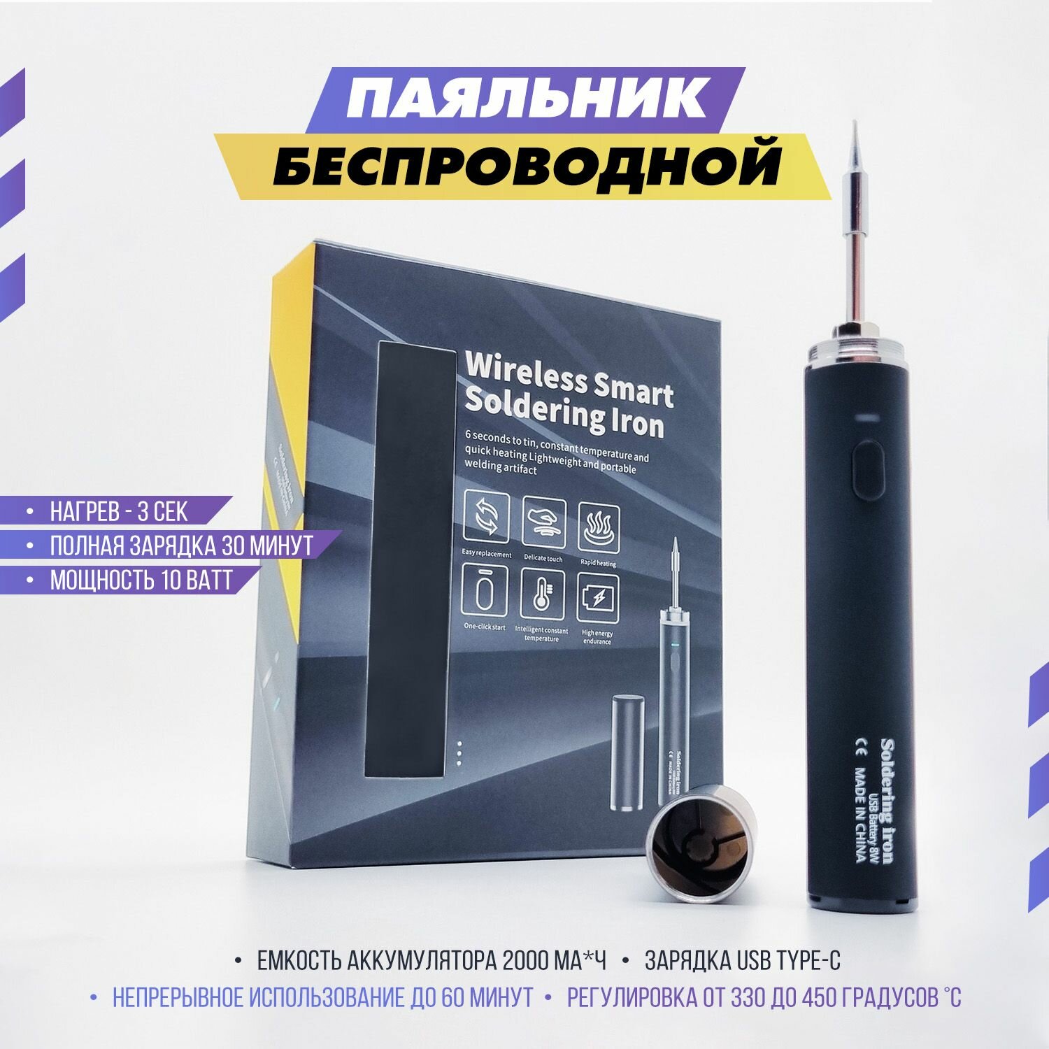 Паяльник беспроводной USB, с регулировкой температуры пайки. Электрический, аккумуляторный с защитным колпачком информация: