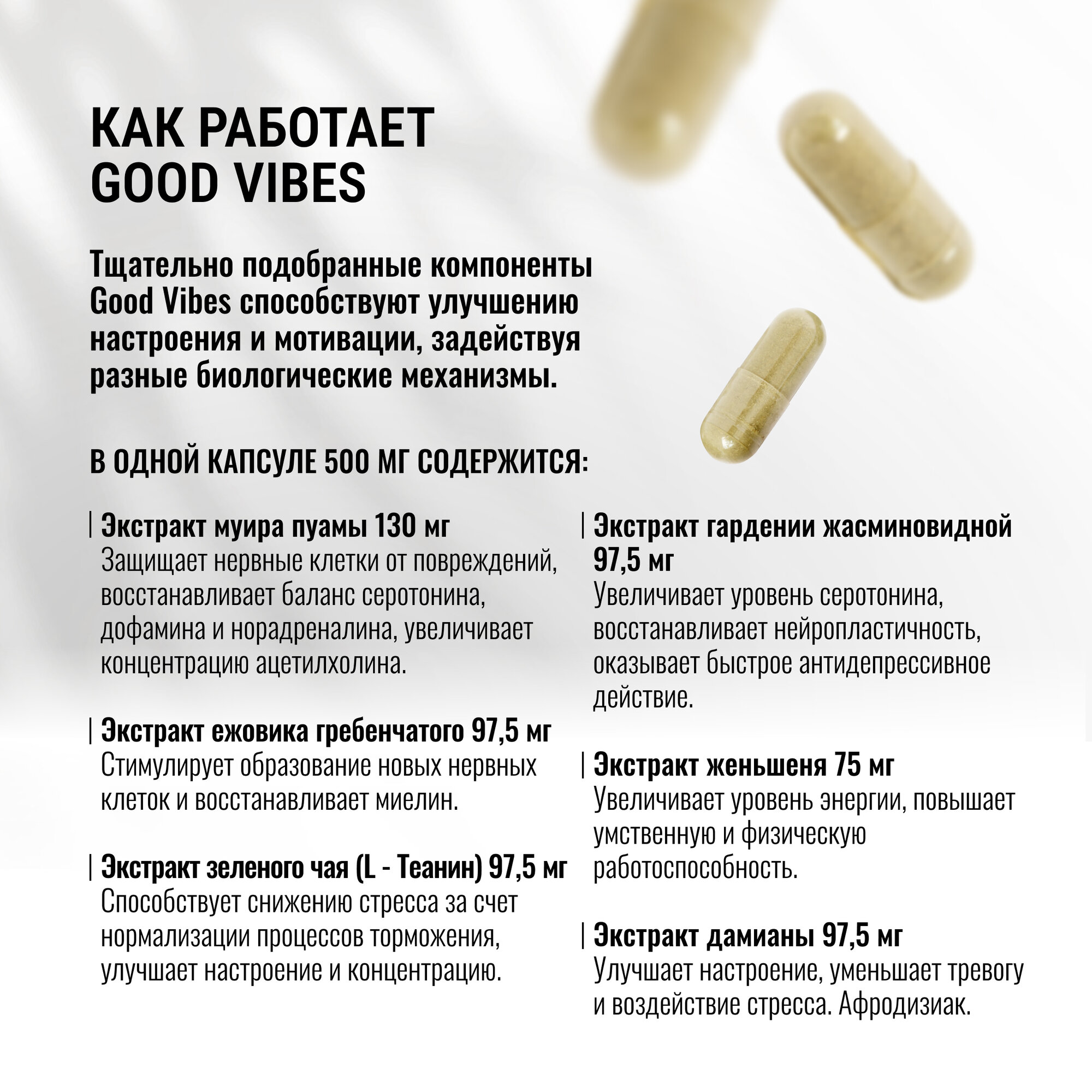 Good Vibes мотивация и позитив 60 капсул Amazonica. Для повышения мотивации и хорошего настроения. Ноотроп. Адаптоген. информация:
