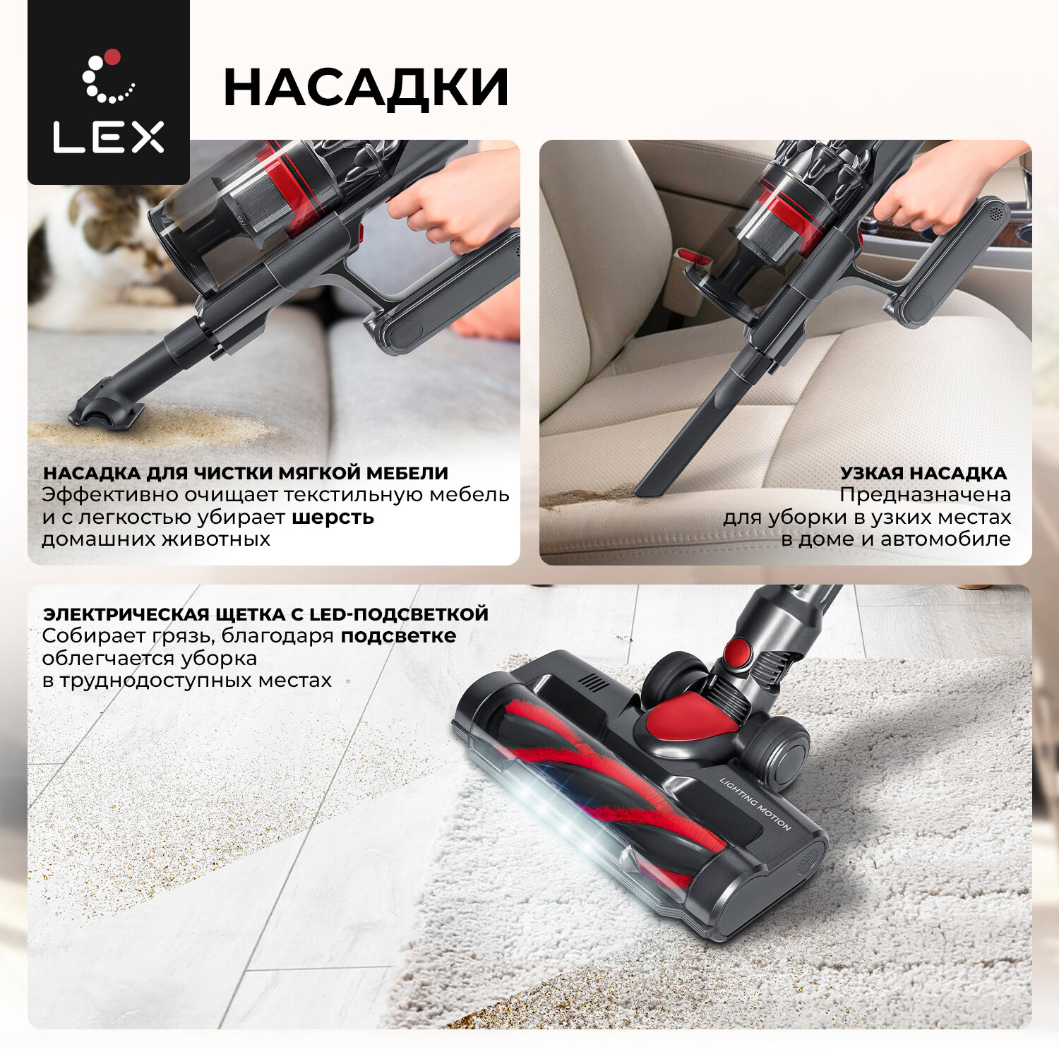 Отзывы на Пылесос беспроводной вертикальный LEX LXVCS 7070, для сухой уборки, 2 скорости, подсветка зоны уборки, емкость аккумулятора, 2200 мАч, 3 насадки, цвет-неповторимый рубиновый.