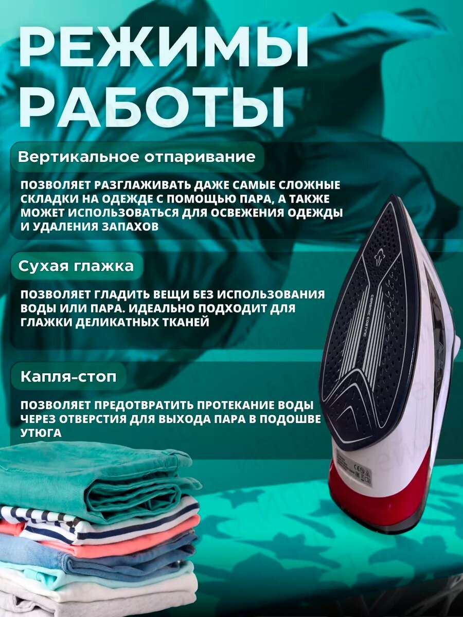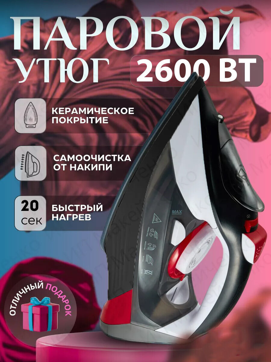 Домашний утюг паровой, с функцией вертикальной глажки, паровой удар, антипригарное покрытие, система самоочистки, 2600ВТ
