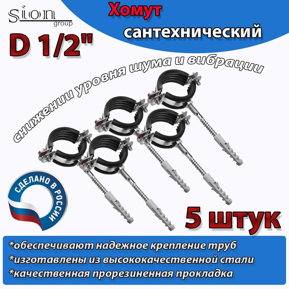 Отзывы на Хомут сантехнический D 1/2" (5 шт) для труб с резиновым уплотнением, шпилькой и дюбелем