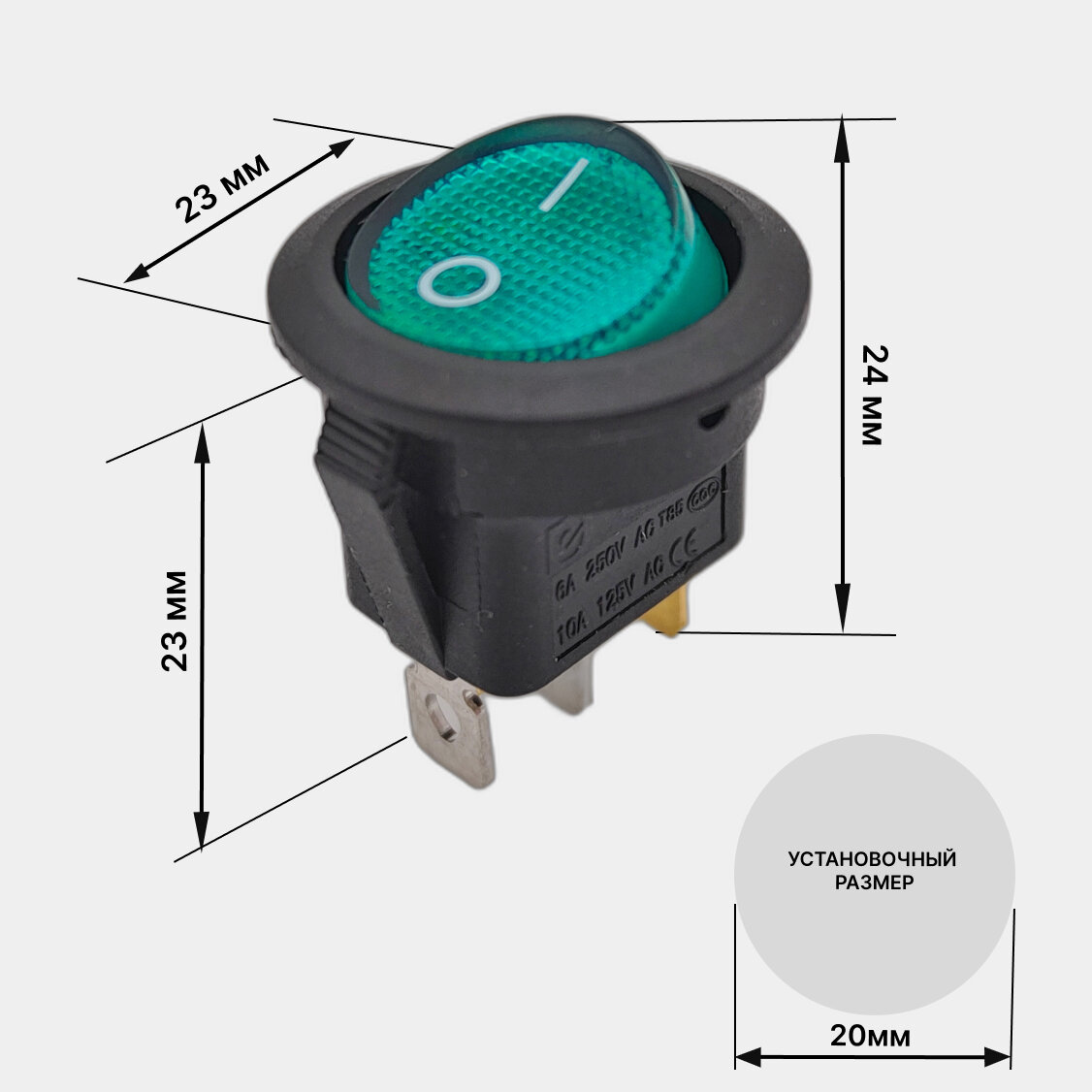 Выключатель клавишный круглый 12V 20А (3с) ON-OFF зеленый с подсветкой (комплект с клеммами и термоусадкой) информация: