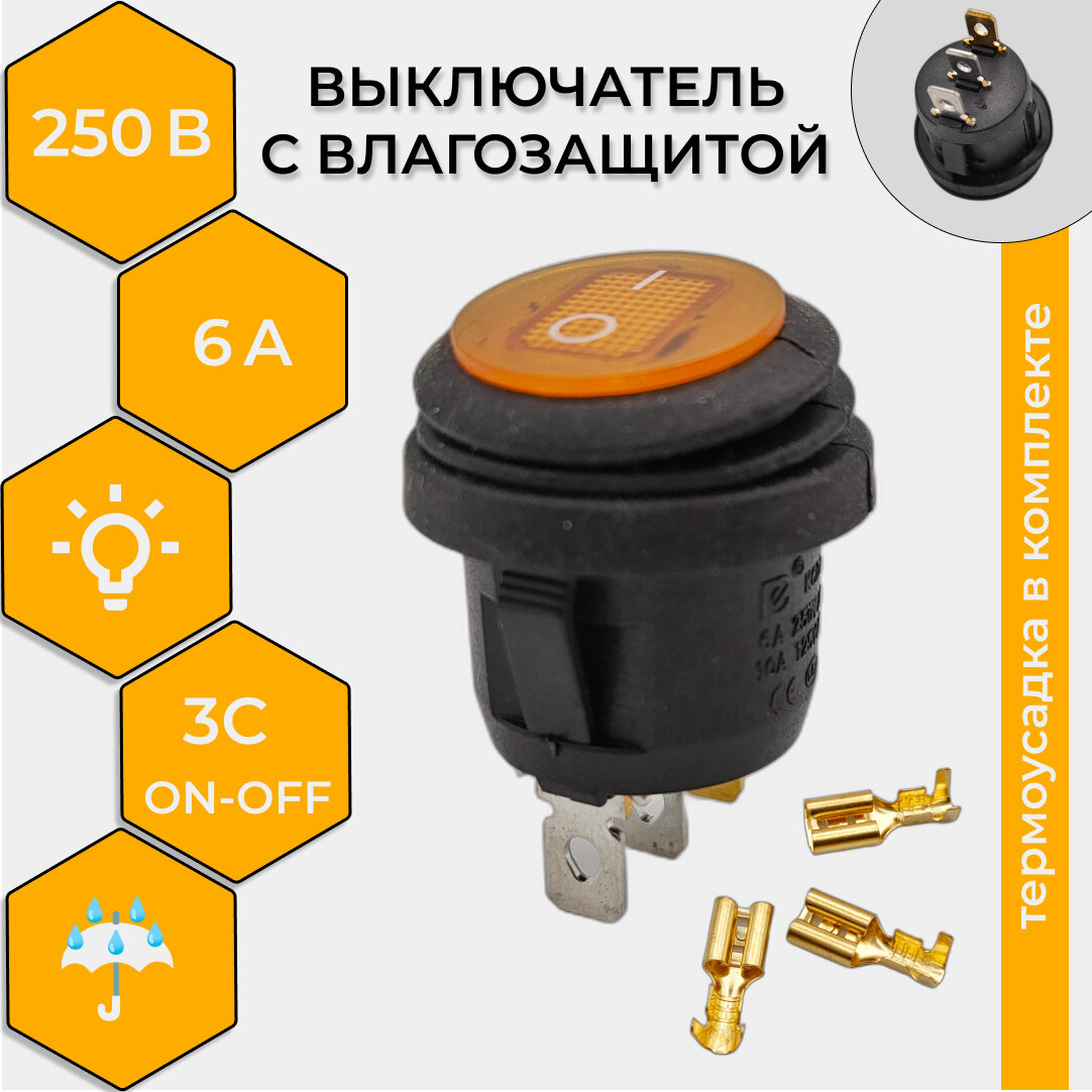 Выключатель клавишный круглый влагозащита подсветка 250V 6А (3с) ON-OFF желтый (комплект с клеммами и термоусадкой) информация: