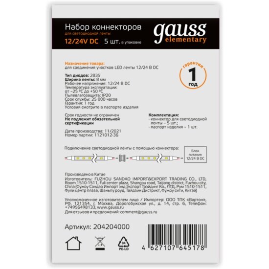 Набор коннекторов для светодиодной ленты Gauss 2835/60SMD 5 шт. в упак. информация: