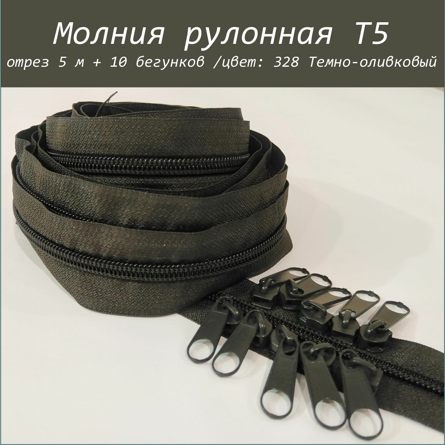 10 цен на Молния рулонная спираль (витая) цвет 328 Темно-оливковый тип 5 длина 5 м + бегунок 10шт