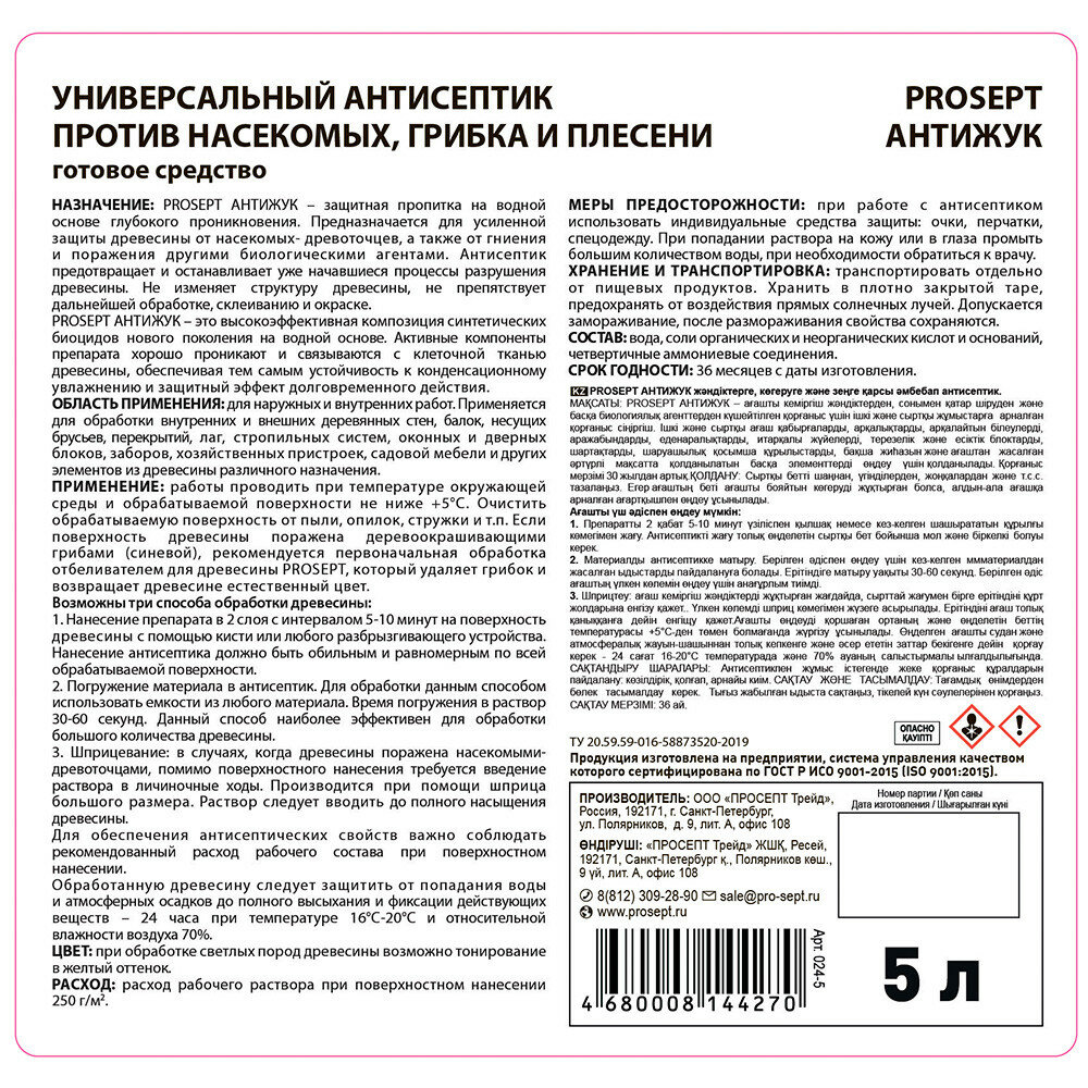 Антисептик prosept антижук против жуков и других биопоражении 5л информация:
