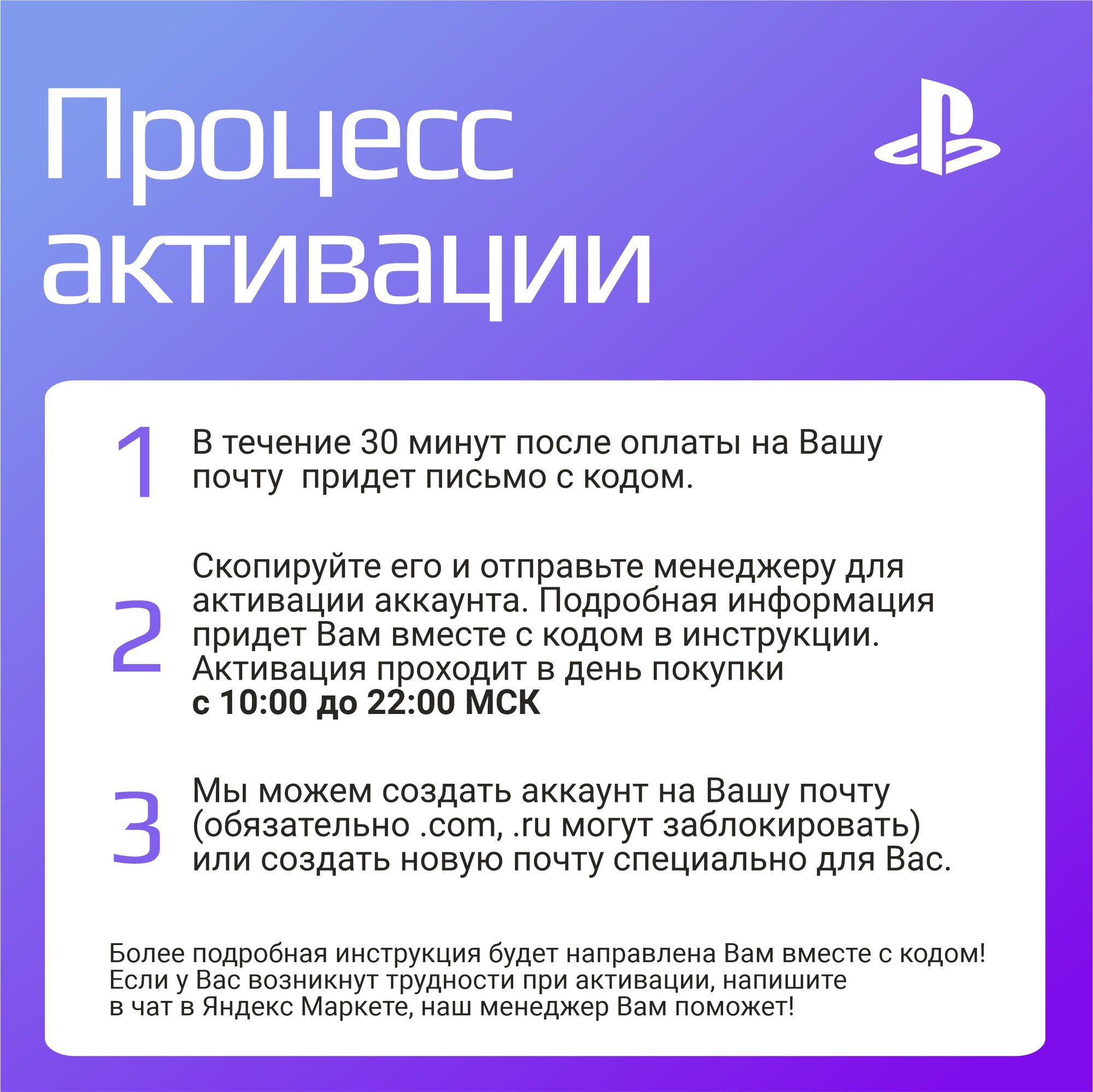 | Инструкция по активации | После покупки Вам придет код на почту. Инструкция по активации: 1. Перейдите в инструкцию по ссылке; 2. Отправьте код личным сообщением менеджеру; 3. Создайте аккаунт совместно с менеджером. |