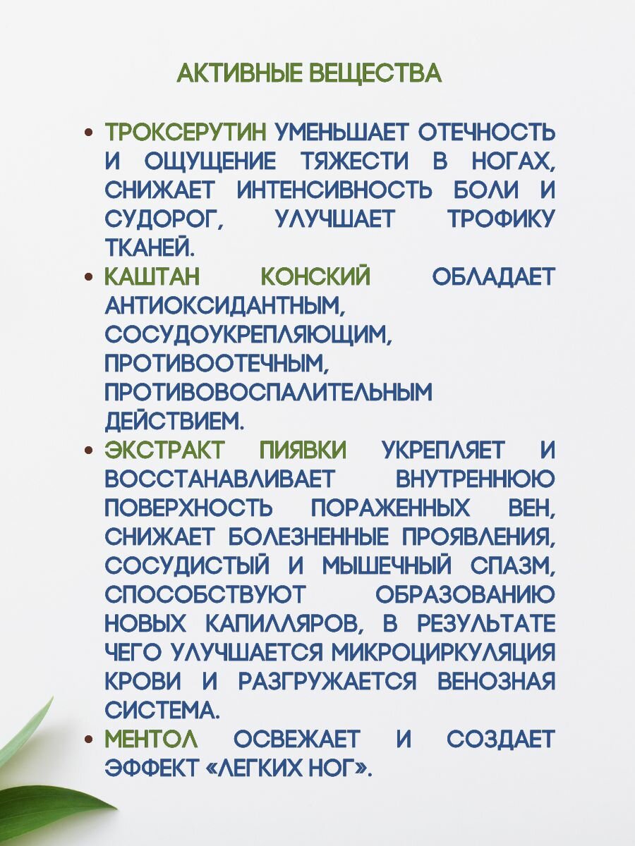 | Фармакологическое действие | Конский каштан в сочетании с троксерутином оказывает мощное венотонизирующее и противоотечное действие. Гель укрепляет стенки сосудов, улучшает крово- и лимфообращение, способствует восстановлению прочности и эластичности сосудов, повышает тонус венозных стенок и клапанов. Снимает отечность, создает быстрый эффект свежести и снятие усталости. Входящий в состав ментол освежает и создает эффект "легких ног". |