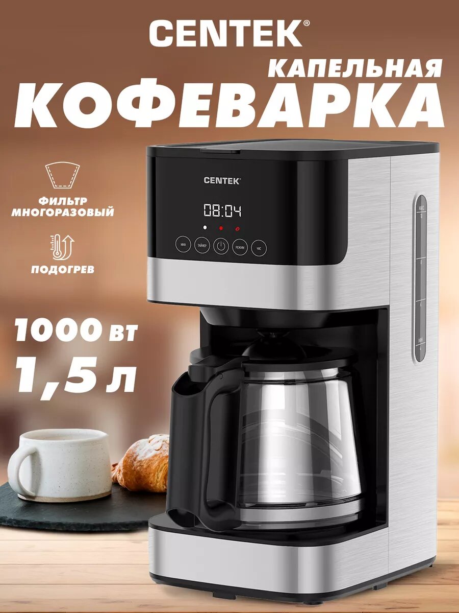 Отзывы на Кофеварка Centek CT-1150 (черн/сталь) капельная 1000Вт, 1.5л, капля стоп, подогрев, сенсор, LED