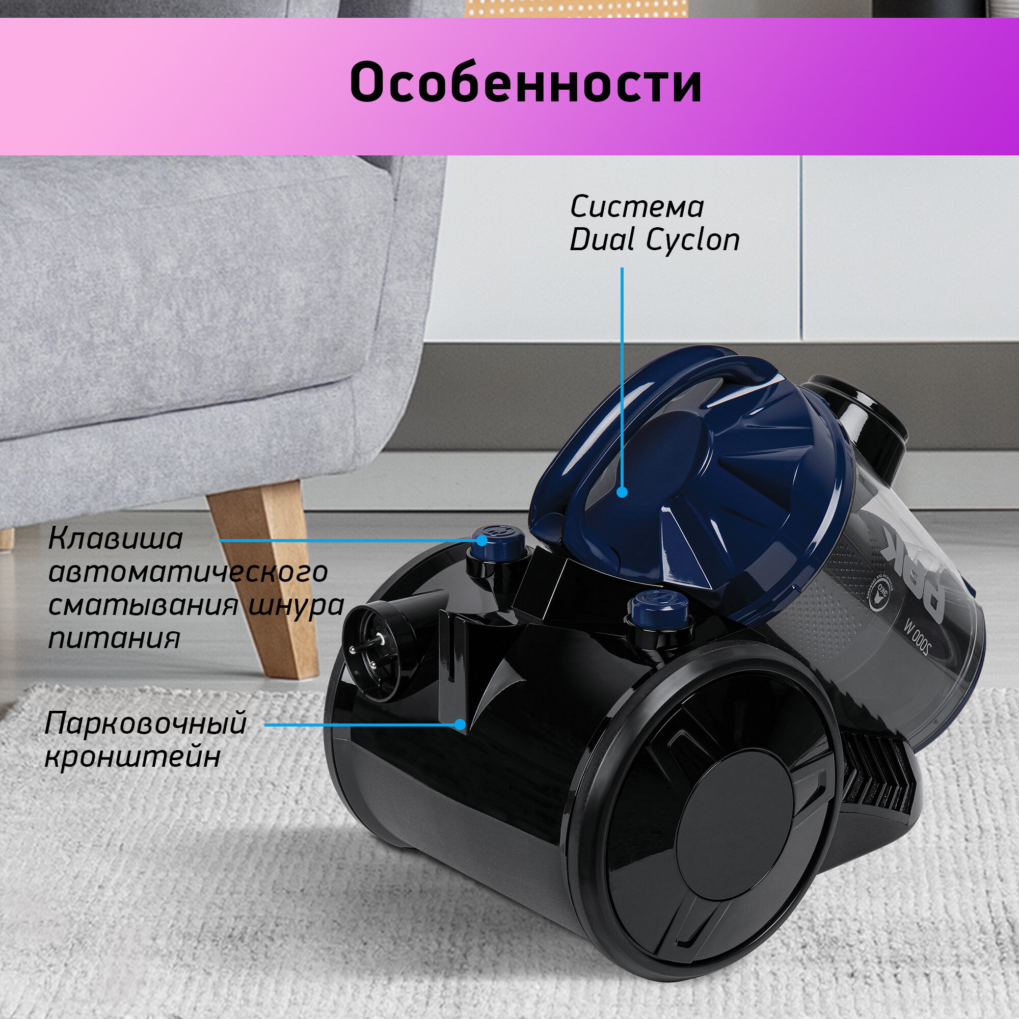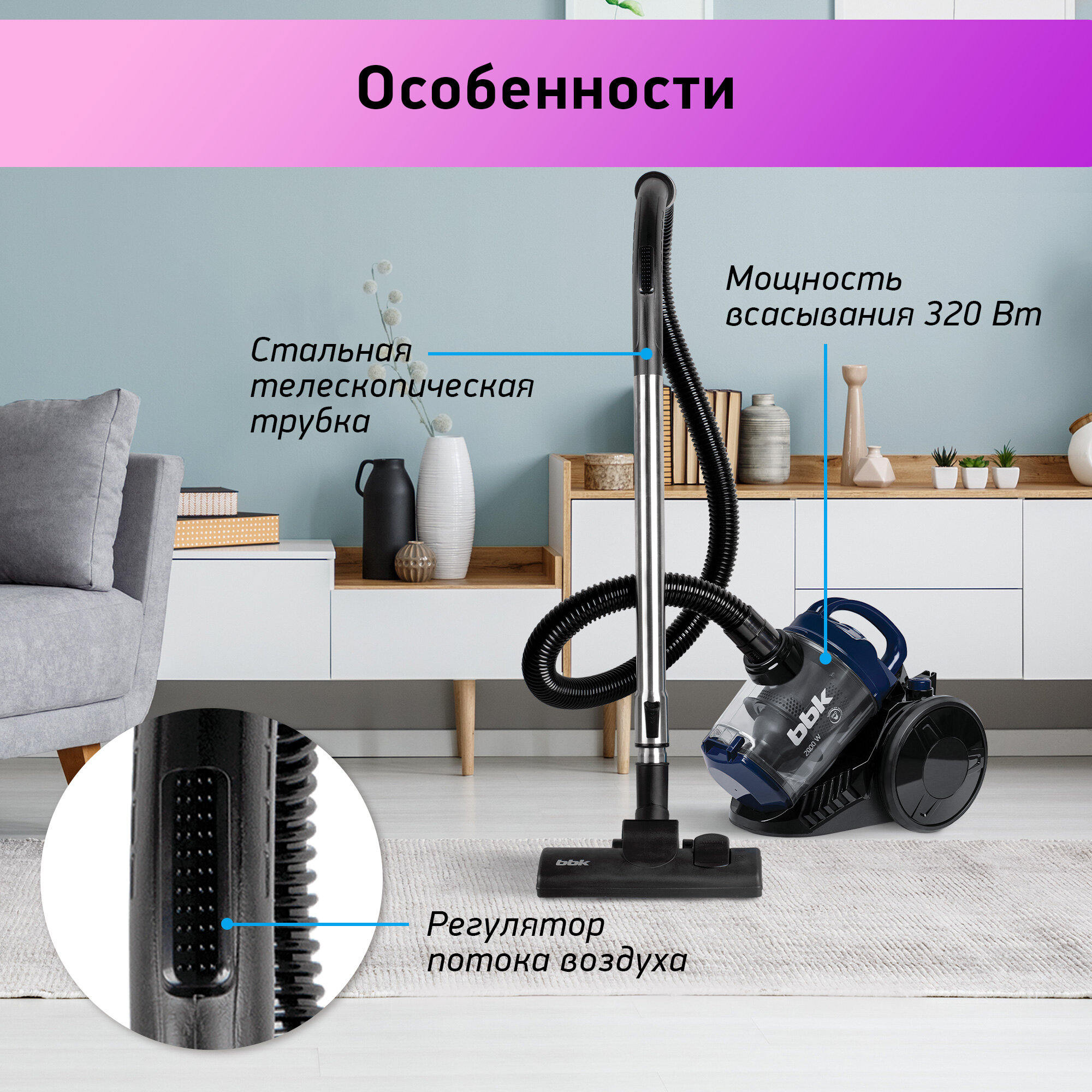 Пылесос циклонный BBK BV1503 черный/синий, мощность 2000 Вт, нера фильтр, мощность всасывания 320 Вт, объем пылесборника 2.5 л, 3 насадки в комплекте информация:
