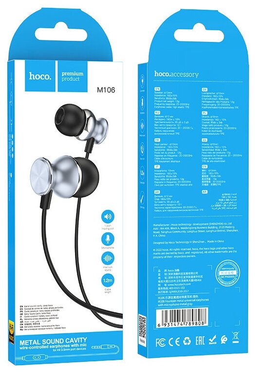 Проводные наушники HOCO M106 Fountain, Jack 3.5mm, 1.2 м, серый металлик информация:
