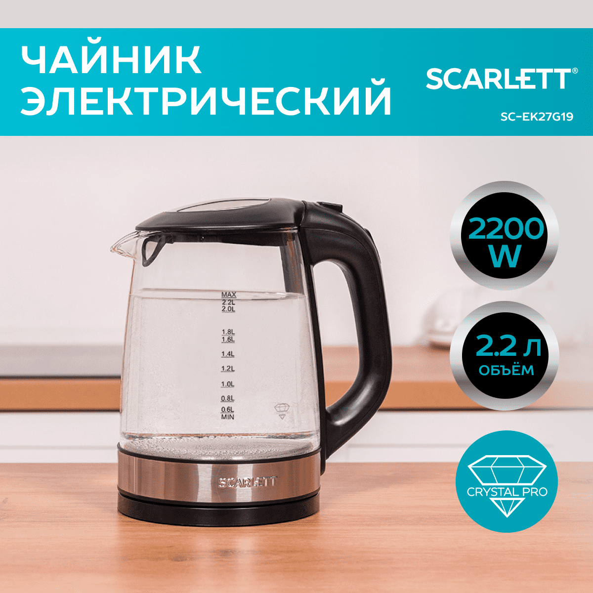 Чайник SCARLETT SC-EK27G19, 2.2 л, 2200 Вт, закрытый нагревательный элемент, стекло, черный 2 327 ₽