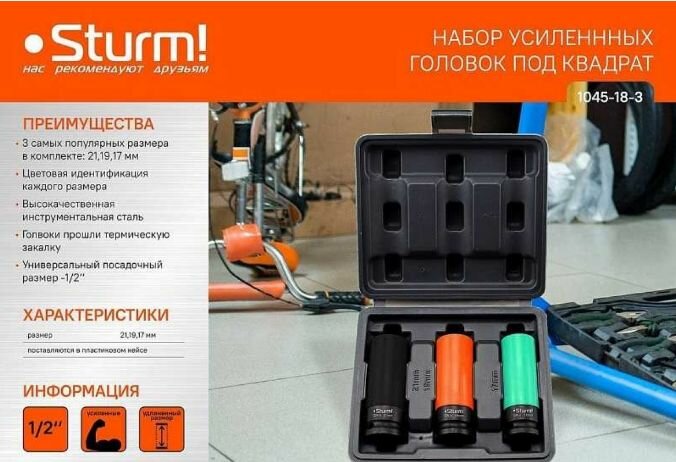 Набор головок, 1/2", 3 шт, пластиковый кейс, CrV Sturm! 1045-18-3 информация: