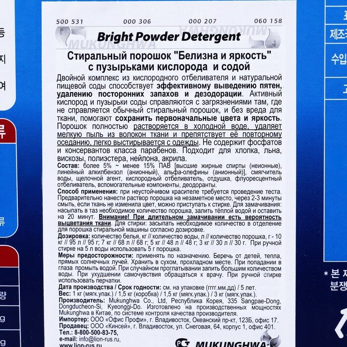 Стиральный порошок Mukunghwa Белизна и яркость, с пузырьками кислорода и содой, 1,5 кг информация:
