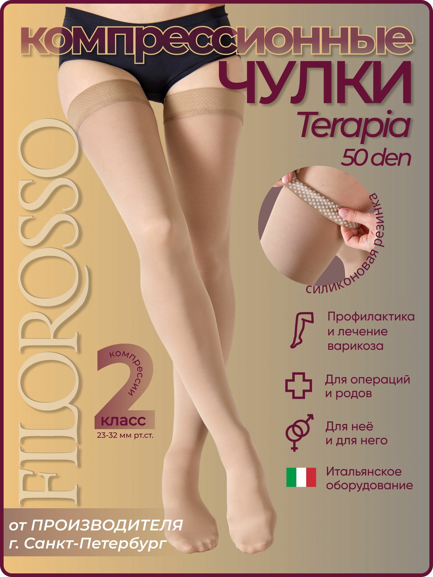 Чулки компрессионные Filorosso Terapia 50 den с силиконовой резинкой, 2 класс компрессии, бежевый, размер 2 информация: