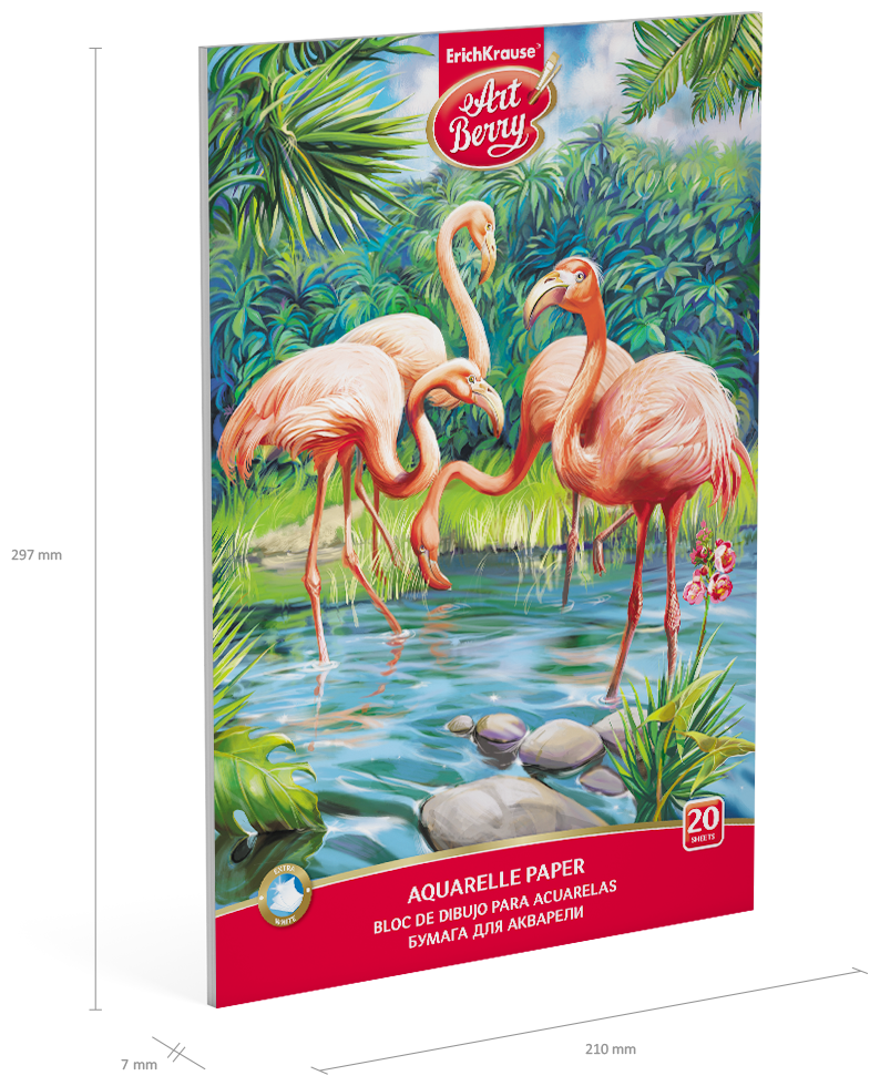 Альбом для акварели А4, 20 листов на клею, ArtBerry «Фламинго», обложка мелованный картон 170 г/м2, блок 180 г/м2, экстра белая. В наборе 1шт. информация: