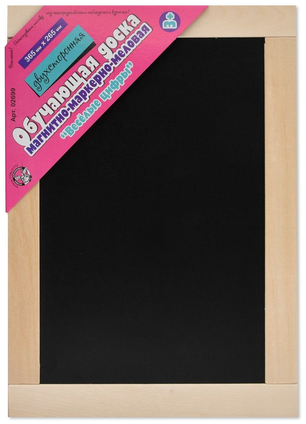 Доска двухсторонняя, обучающая, магнитно-маркерно-меловая Веселые цифры , 36,5см х 26,5см, магнитные цифры и знаки, 45 шт, неокрашенные 02699ДК