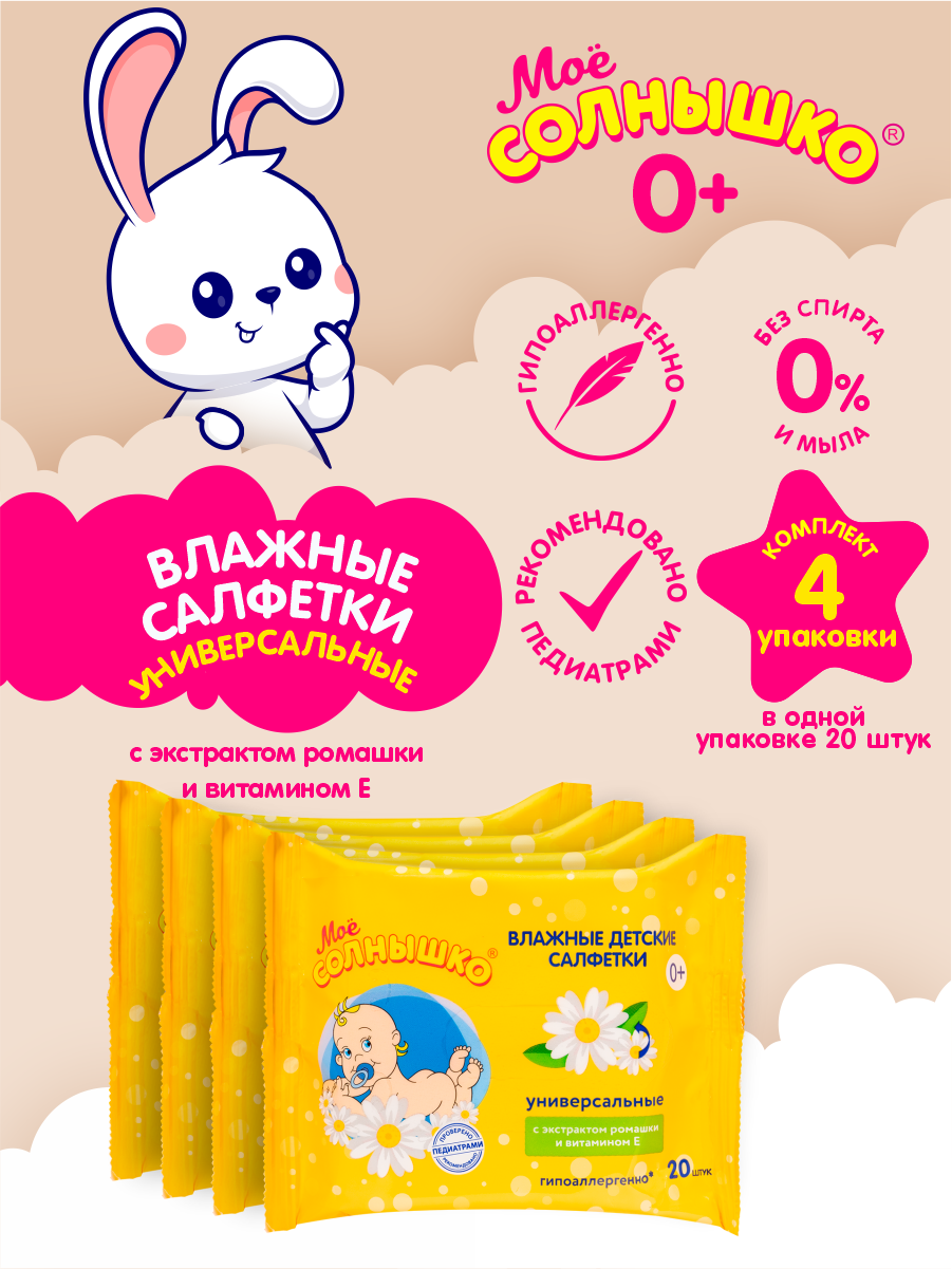 Салфетки влажные детские универсальные Мое Солнышко №20 х 4 шт. информация: