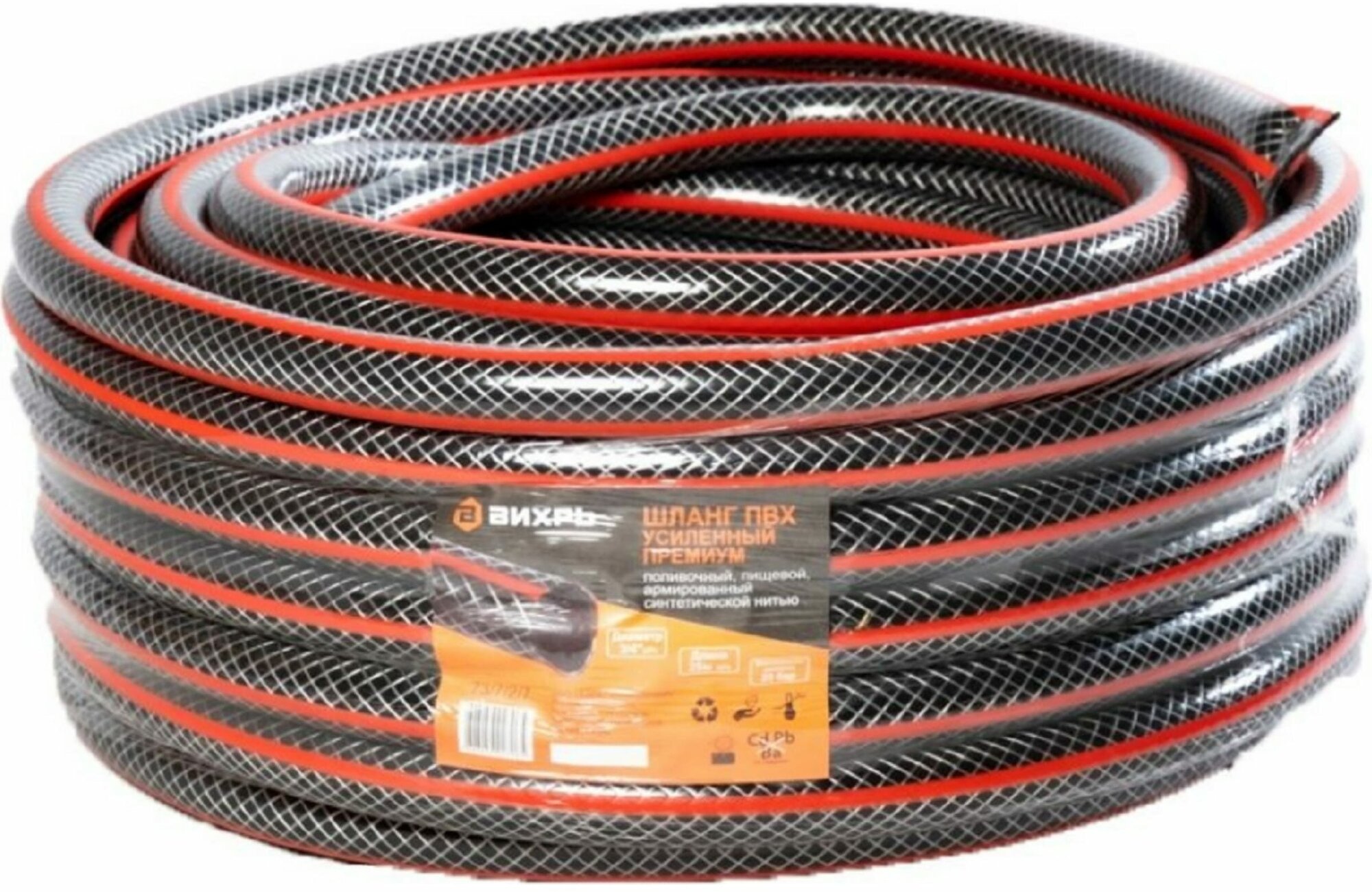 Шланг Вихрь ПВХ усиленный премиум,пищевой трехслойный армированный 3/4, 25 м (чёрн-красн) 73/7/2/7