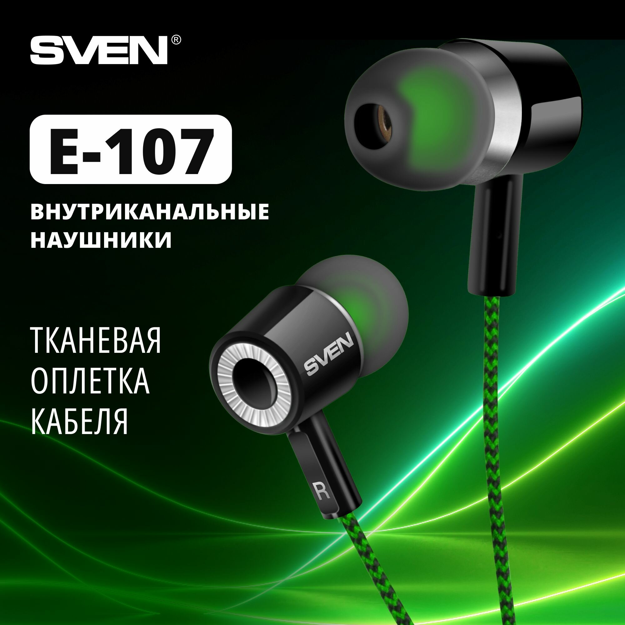 Наушники SVEN E-107, черный-зеленый, внутриканальные стерео 1573802 SV-015404