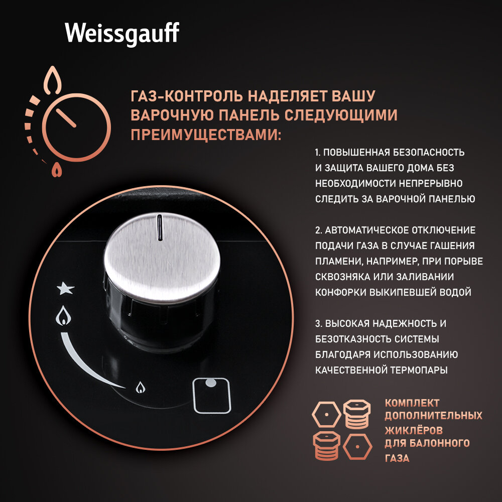 Варочная панель Weissgauff HGG 640 BGBV, Рукоятки Hi-Tech, Автоматический электроподжиг