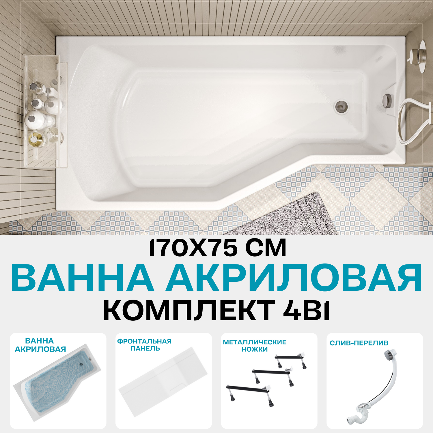 Ванна акриловая 170х75 см 1MARKA Convey в наборе 4 в 1: Асимметричная ванна левый угол, металлические ножки, фронтальная панель, слив-перелив хром 01кон1775лкп информация: