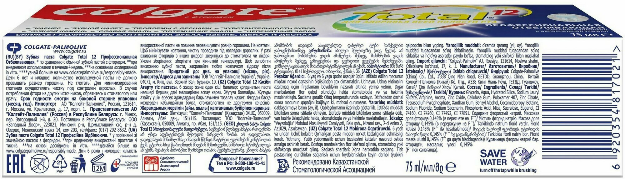 Colgate Зубная паста Total 12 Профессиональная Отбеливающая комплексная антибактериальная, 75 мл - 1 шт информация: