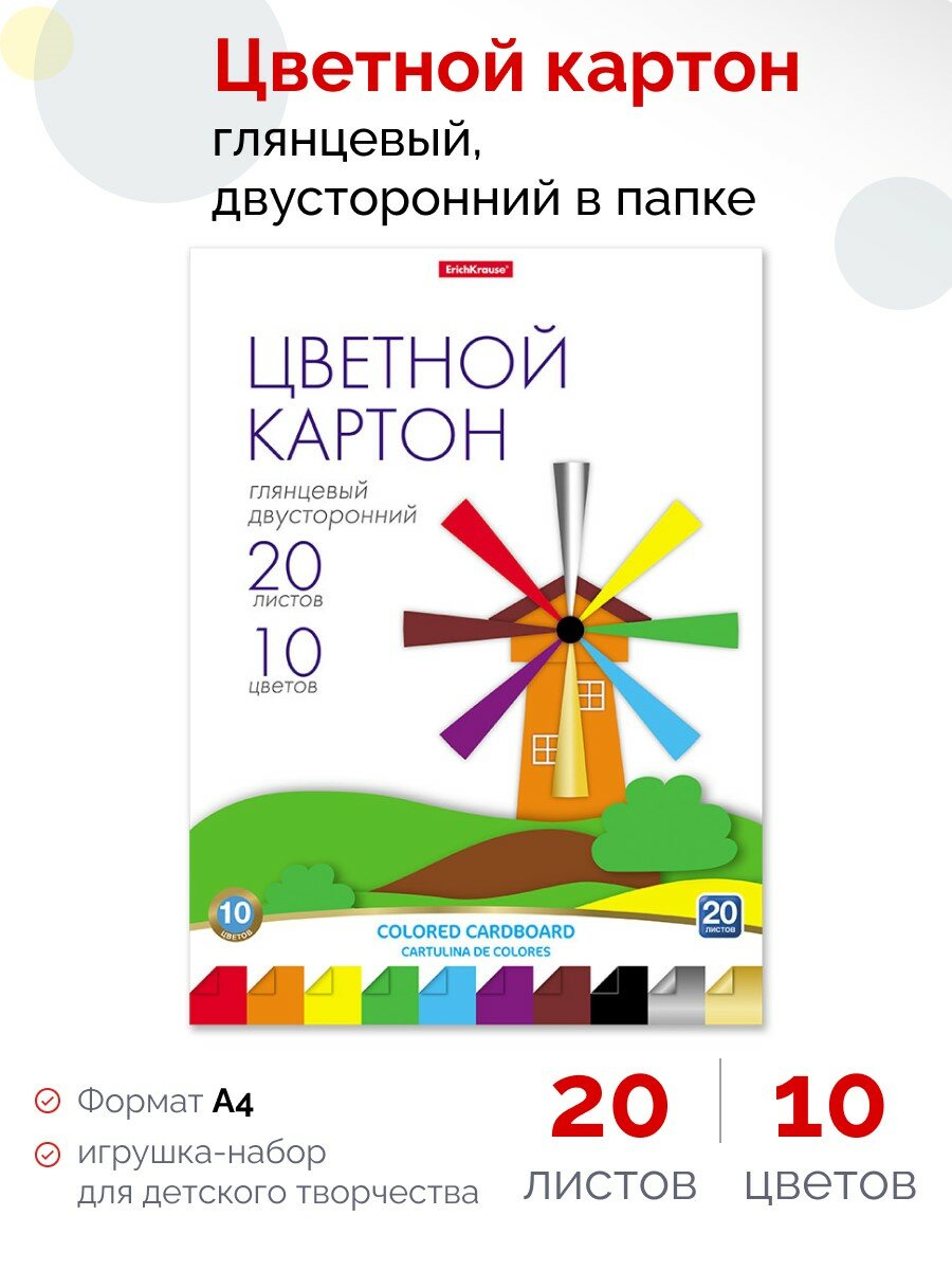 Картон цветной А4, 20 листов, 10 цветов, глянцевый в папке, набор для детского творчества информация: