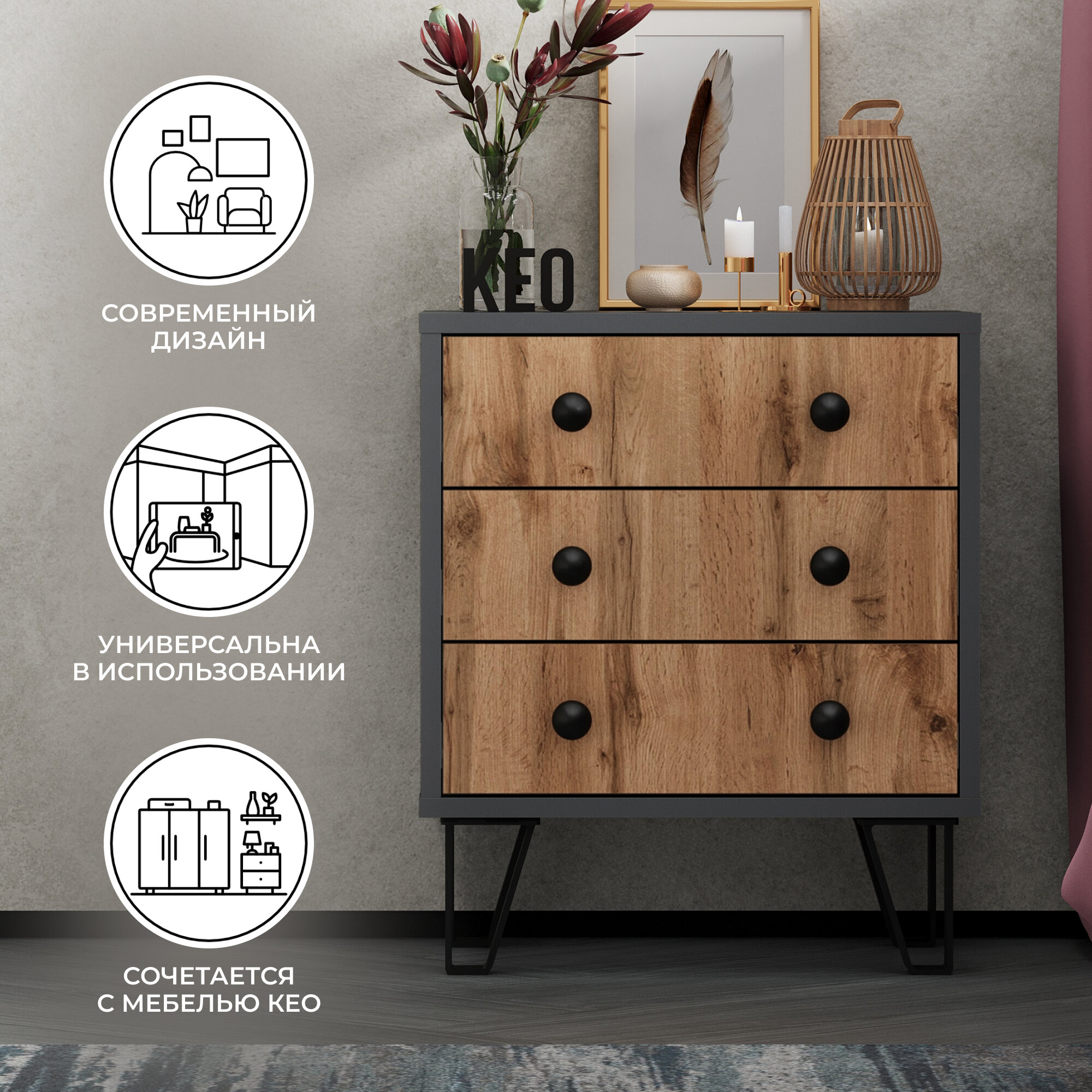 Комод Кео для вещей с 4 ящиками, антрацитовый и дубовый вотан, 87х60х35 см 7 470 ₽