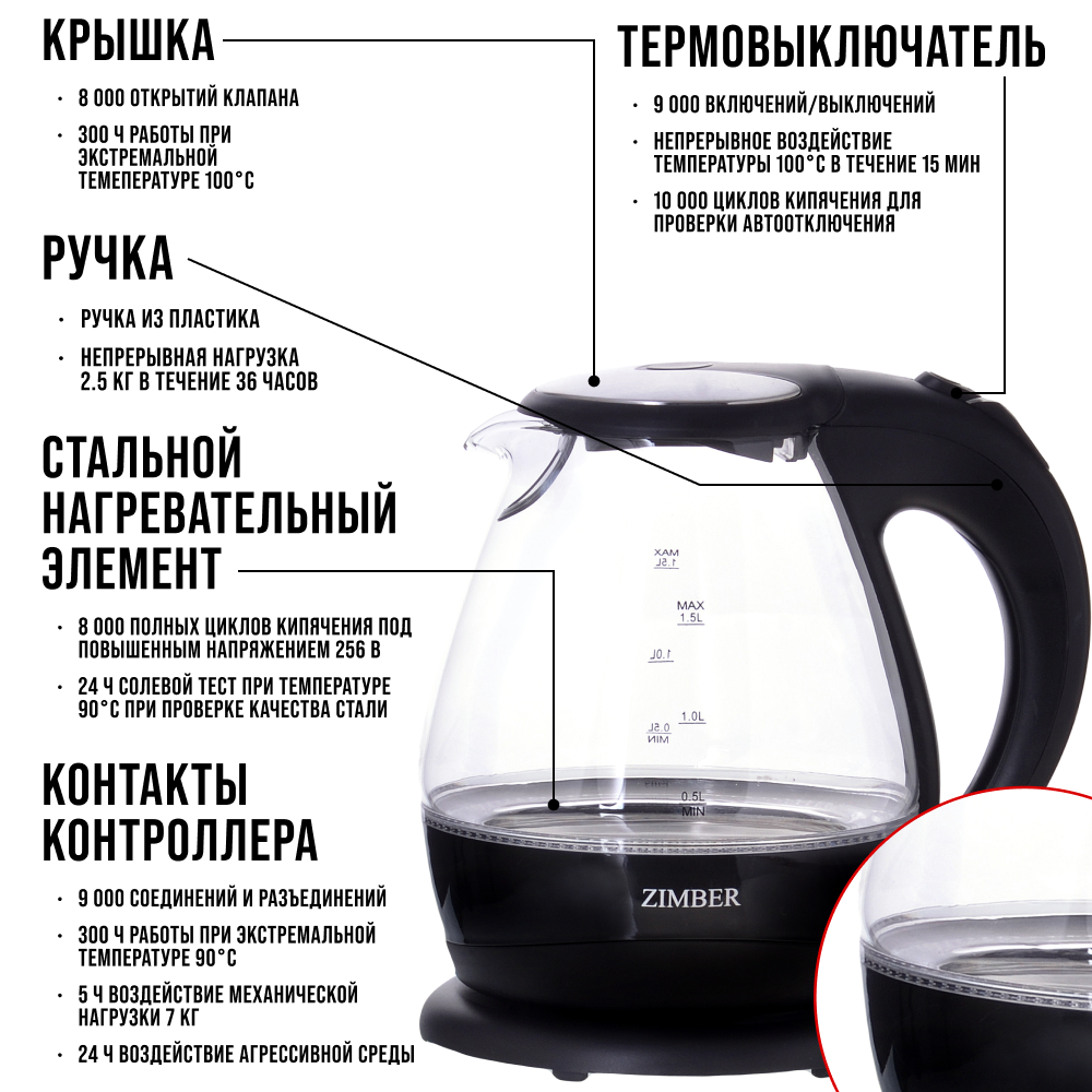 Чайник электрический ZIMBER, 1,5 л, стеклянный с подсветкой 11183 информация: