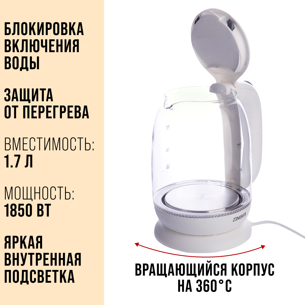 Электрический чайник ZIMBER, 1,7л, стеклянный с подсветкой 11252 информация: