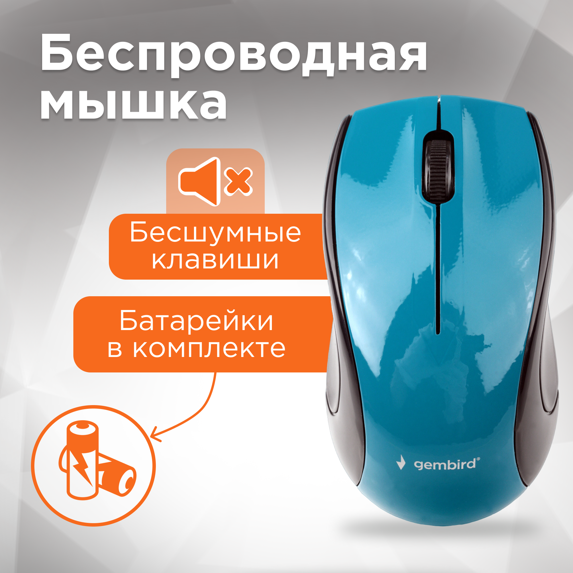 Мышь беспроводная Gembird MUSW-320-B, 2.4ГГц, голубой, 2 кнопки+колесо-кнопка, 1000 DPI, батарейки в комплекте, блистер 850 ₽