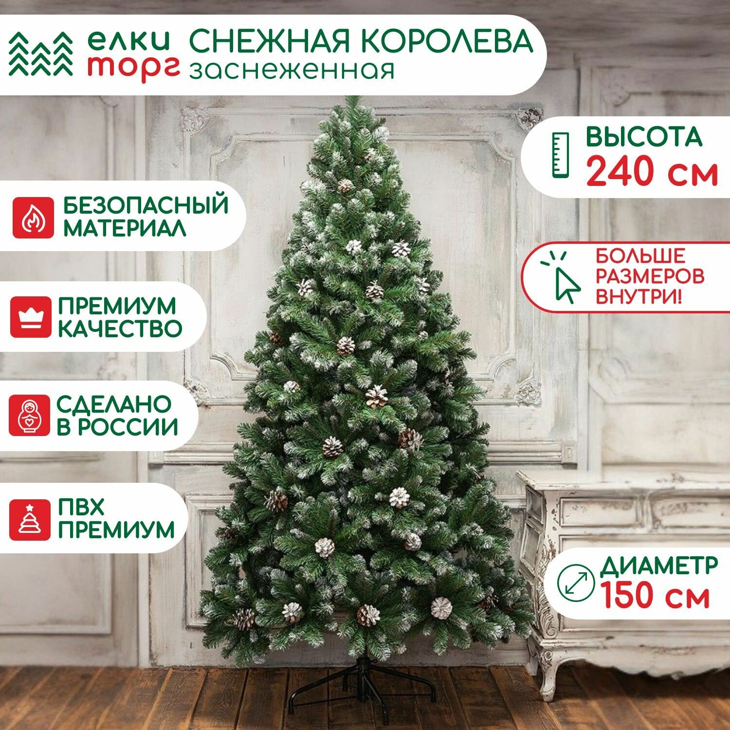 Искусственная елка Снежная королева заснеженная с шишками 240 см., ЕлкиТорг