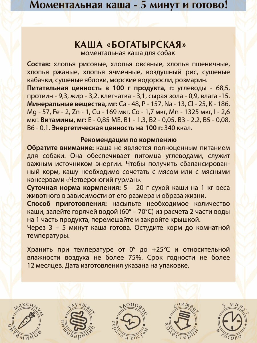Каша для собак "Богатырская" , злаковые хлопья моментального приготовления, 300 г х 6 шт. информация: