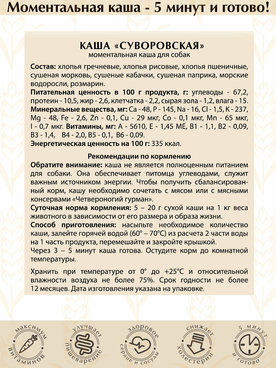 Каша для собак "Суворовская" , злаковые хлопья моментального приготовления, 300 г х 6 шт. информация: