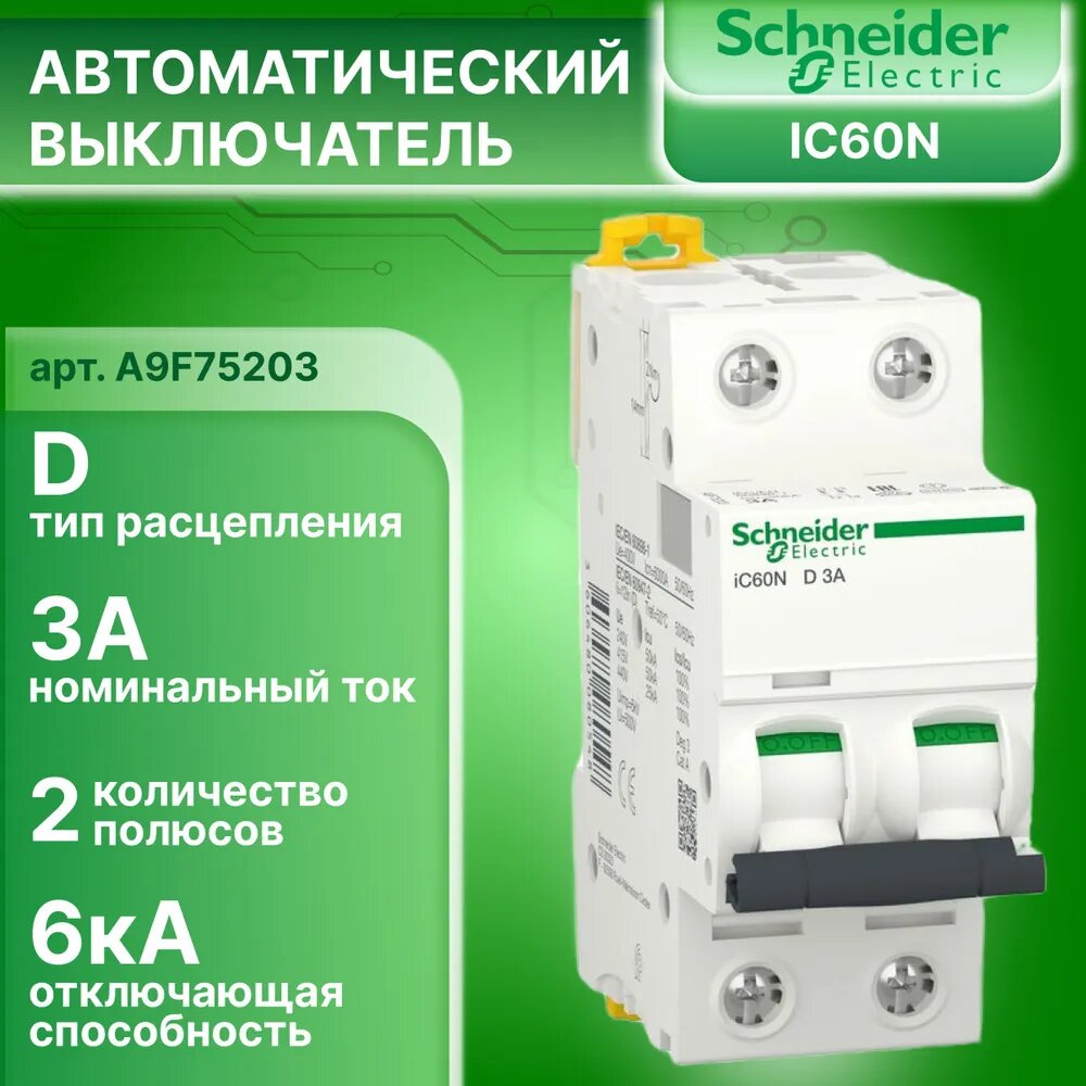 Отзывы на Выключатель автоматический модульный 2п D 3А 6кА Acti9 iC60N SchE, SCHNEIDER ELECTRIC A9F75203 (1 шт.)