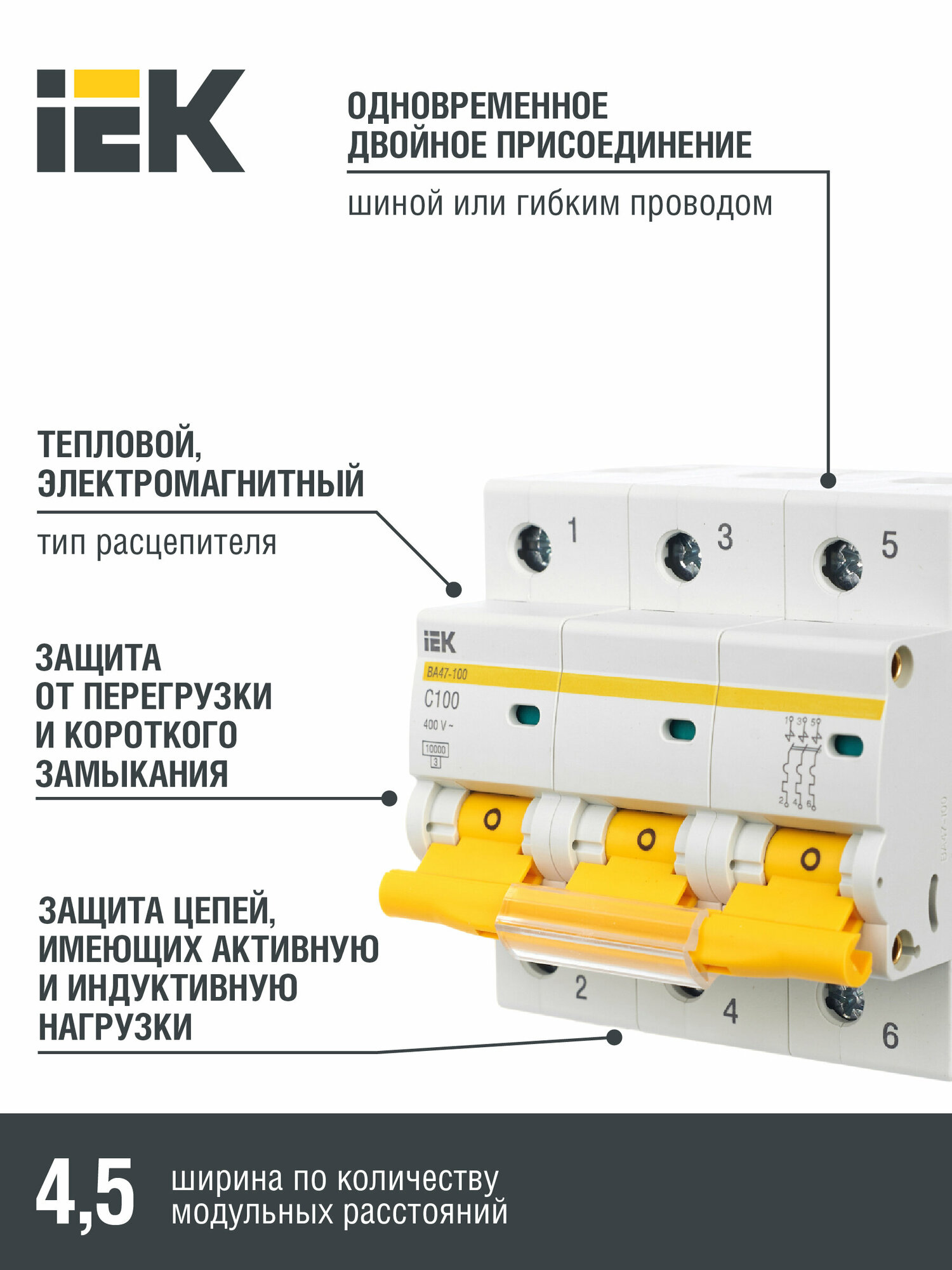 Автоматический модульный выключатель IEK 3п C 100А ВА 47-100 10кА ИЭК 2 500 ₽