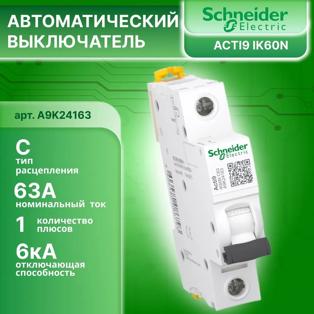 Автоматический выключатель 1п (1P) 63А тип C 6кА Acti9 iK60 Schneider Electric A9K24163 1шт информация: