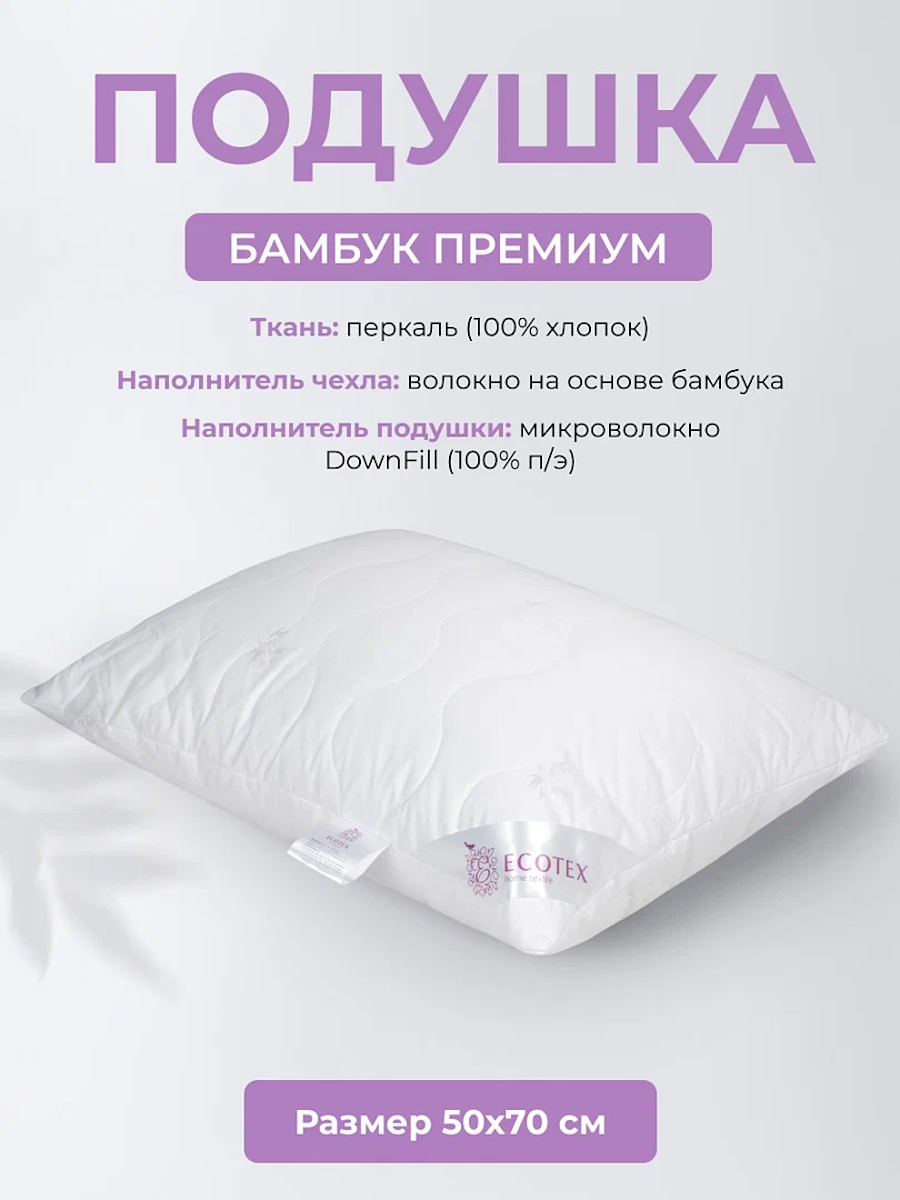 Подушка 50х70 "Бамбук Премиум", чехол - перкаль (100% хлопок), Ecotex информация: