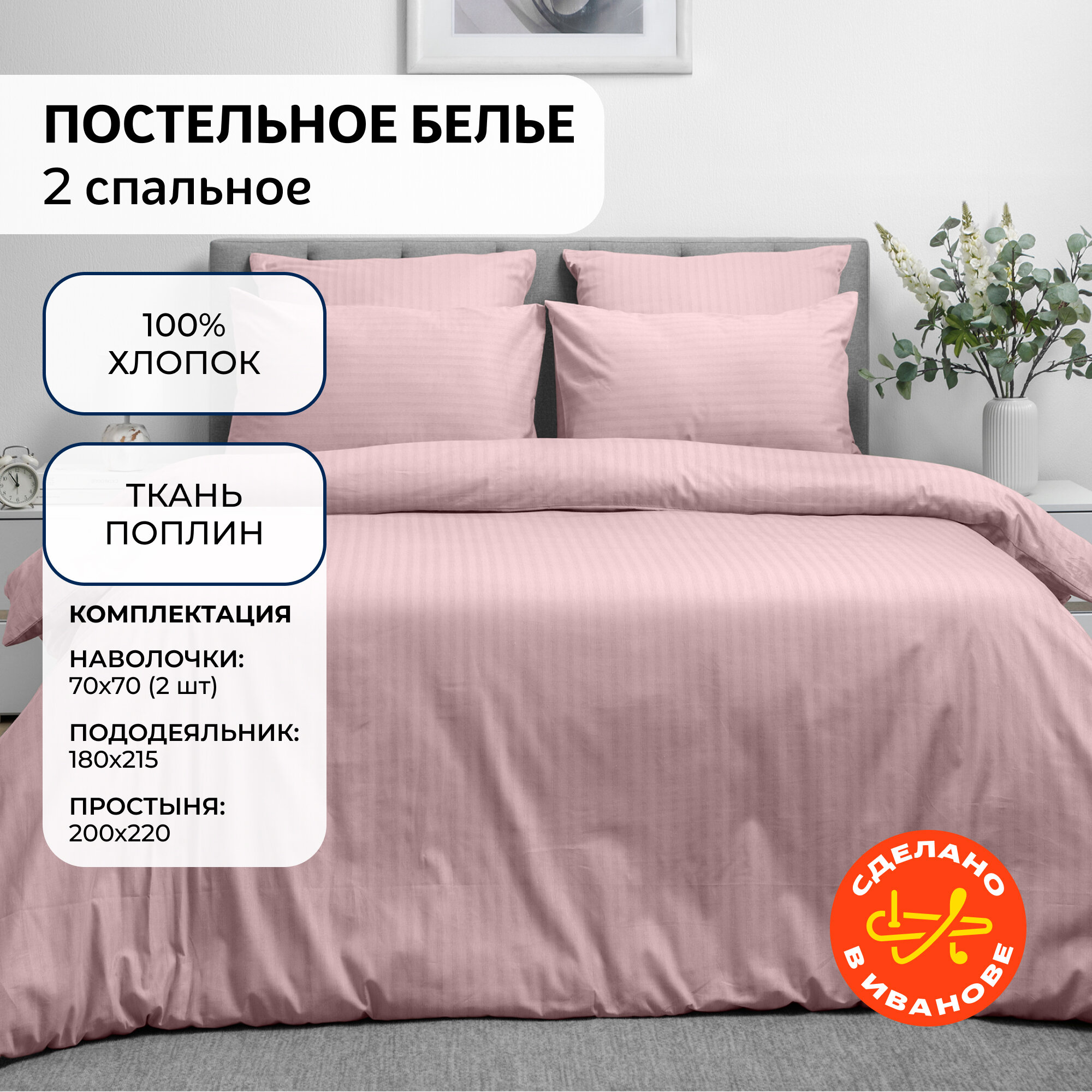 Постельное белье 2 спальное, наволочки 50х70, поплин, хлопок 100% 3 990 ₽