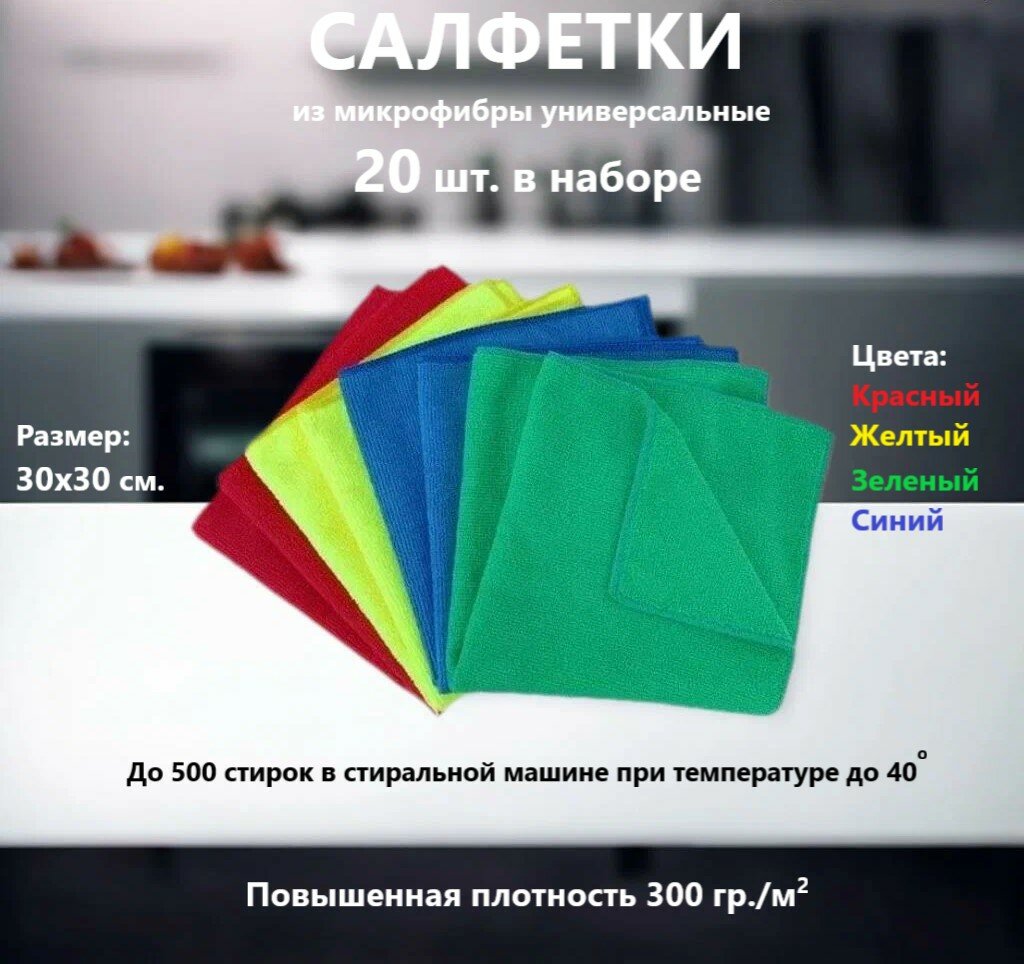 Салфетки для уборки из микрофибры универсальная ЭкоКоллекция 30х30 см, повышенная плотность 300 г/м2, цвет в ассортименте (синий, красный, желтый, зеленый), набор 20шт информация: