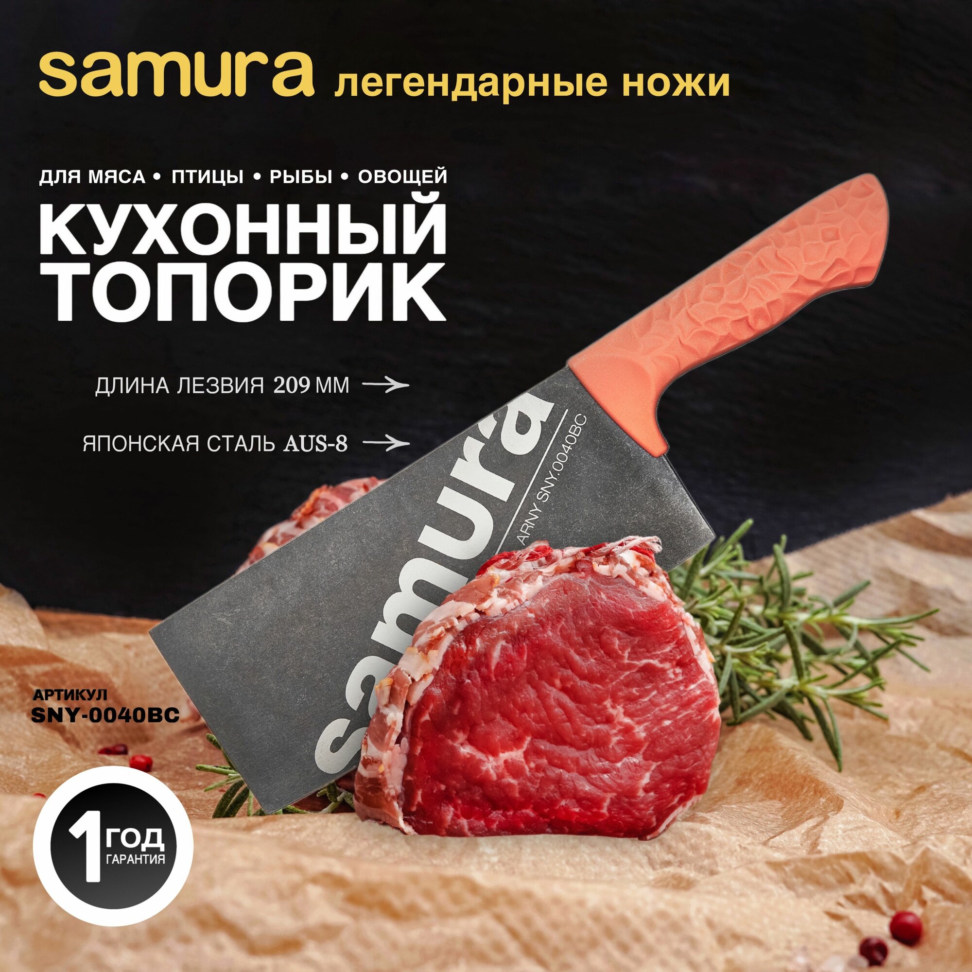 Отзывы на Топорик кухонный, азиатский Samura ARNY, 209 мм, ТЭП коралловый, AUS-8 с галтовкой (SNY-0040BC/K)