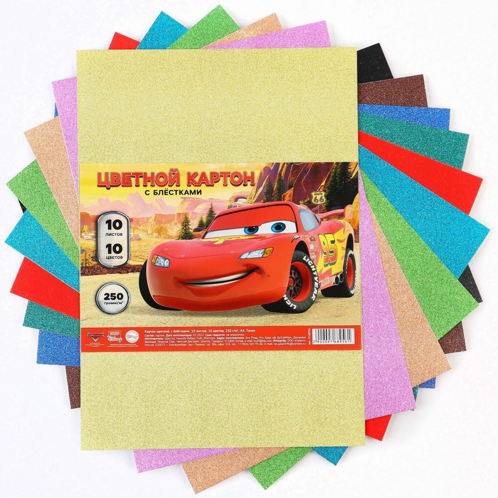 10 цен на Картон цветной с блёстками, А4, 10 листов, 10 цветов, немелованный, односторонний, в пакете, 250 г/м?, Тачки