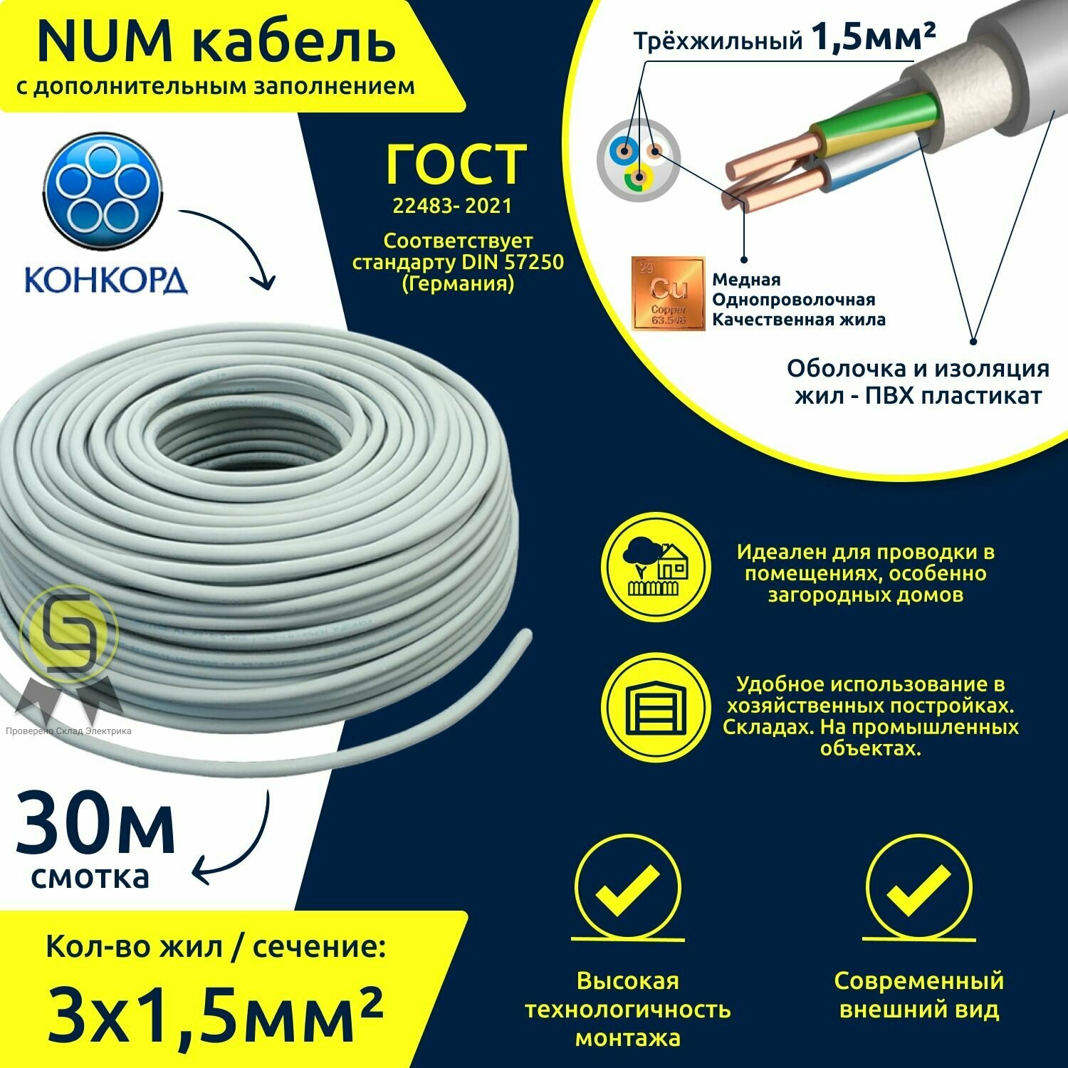 Кабель силовой медный NUM 3х1,5 мм2 круглый с заполнением ГОСТ конкорд (смотка 30м) информация: