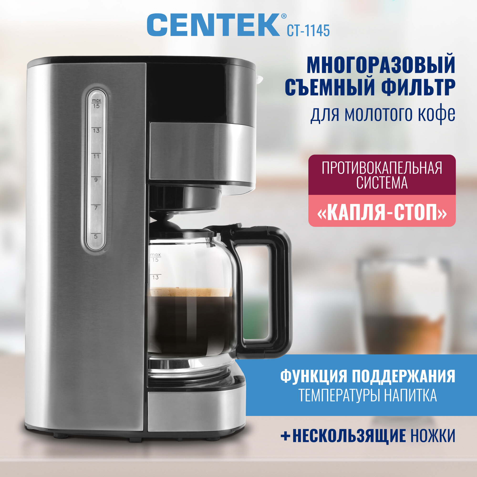 Кофеварка Centek CT-1145 капельная 900Вт, 1500мл, 3 ур. крепости, LED, капля стоп, подогрев