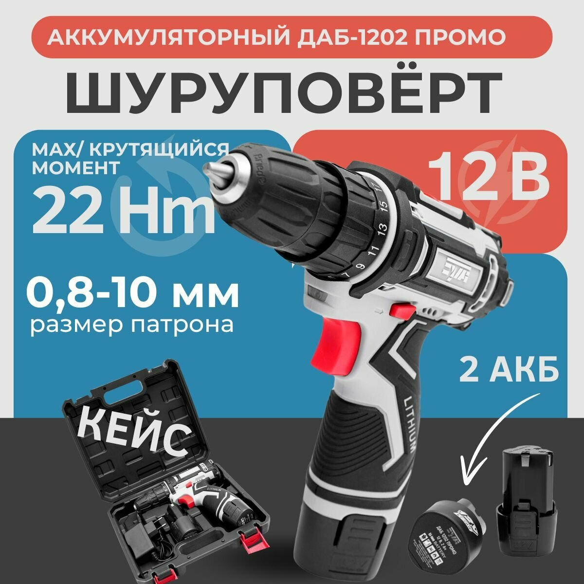 Аккумуляторная дрель-шуруповёрт Li-ion EWA ДАБ 1202 промо, 12 В, 2 Ач, 22 Hm, 0-400/0-1400 об/мин, 25+1 (АКБ*2 шт, ЗУ) 3 318 ₽