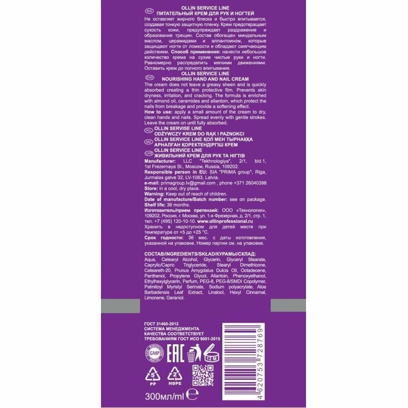 OLLIN SERVICE LINE NOURISHING CREAM HAND&NAIL питательный крем для РУК И ногтей 300 МЛ