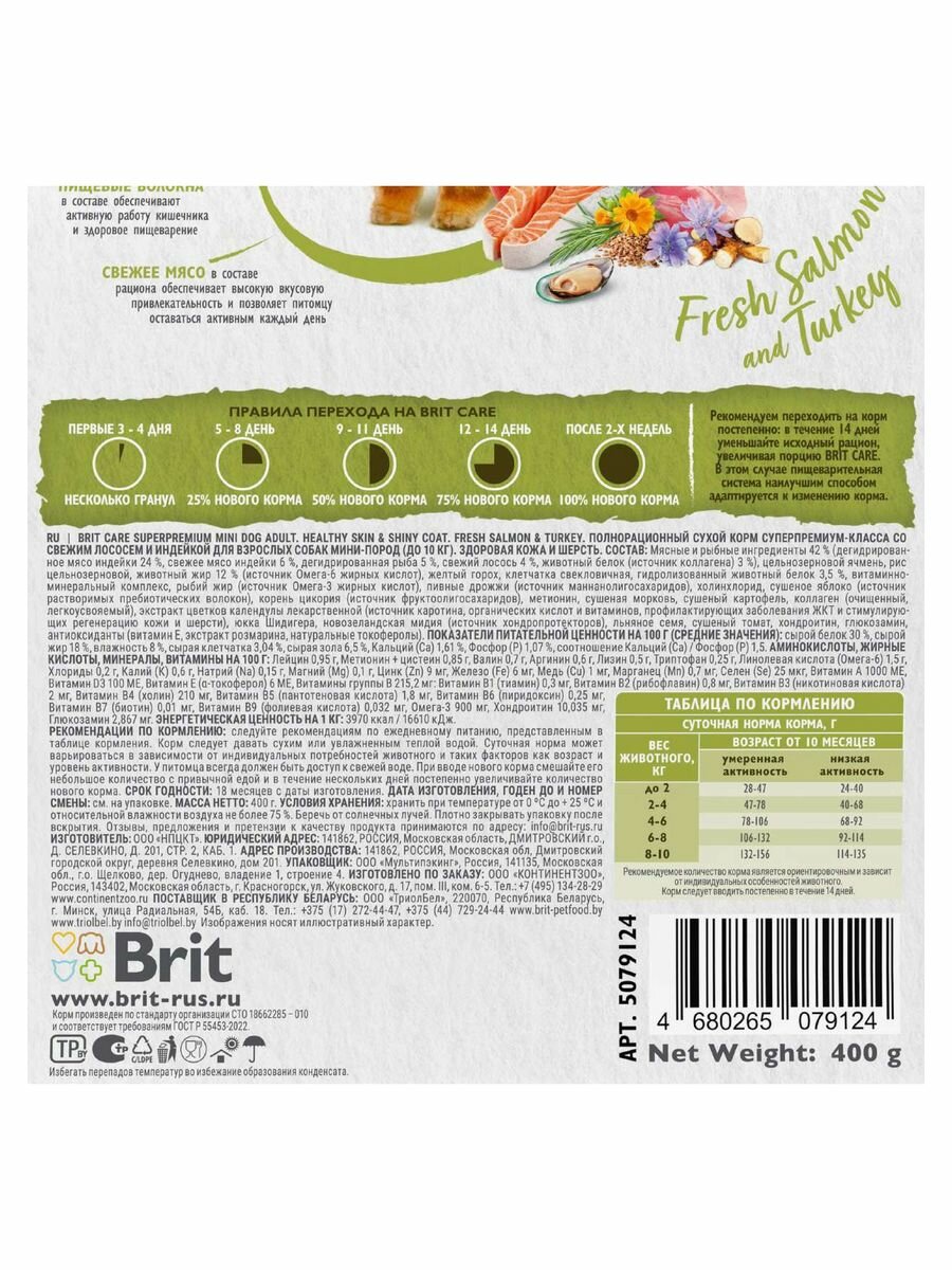 Brit Care Mini Adult Healthy Skin&Shiny Coat сухой корм для взрослых собак мелких пород, с лососем и индейкой - 400 г 639 ₽