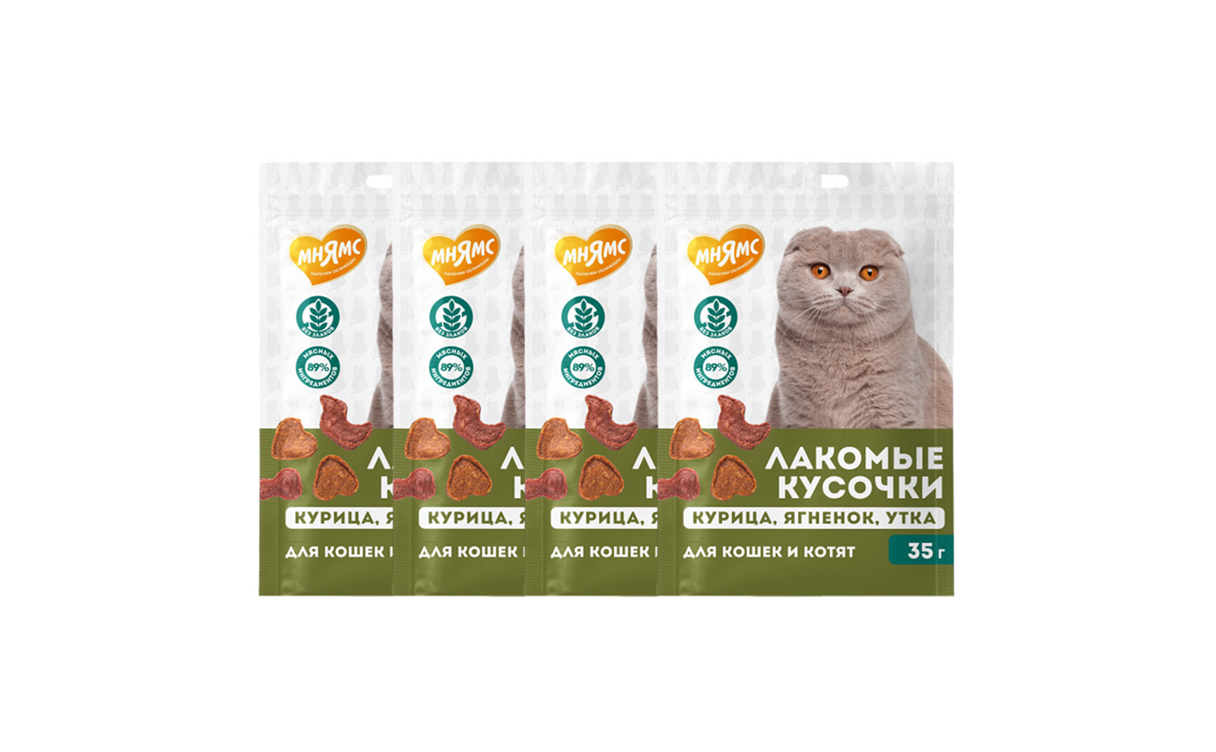 Лакомство Мнямс для кошек и котят "кусочки ассорти" из курицы, ягненка и утки 35 г х 4 шт. информация: