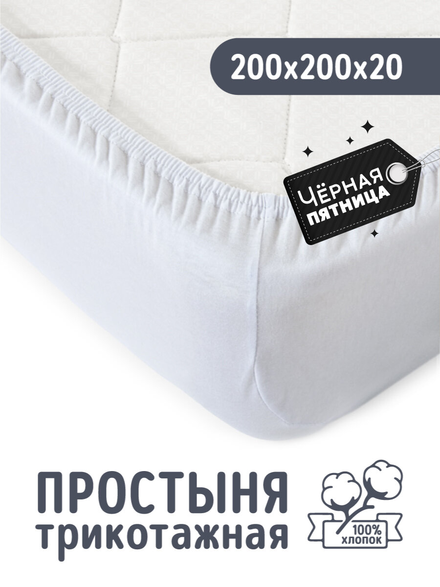 Простыня на резинке Белая, 200х200х20, трикотаж, 100% хлопок